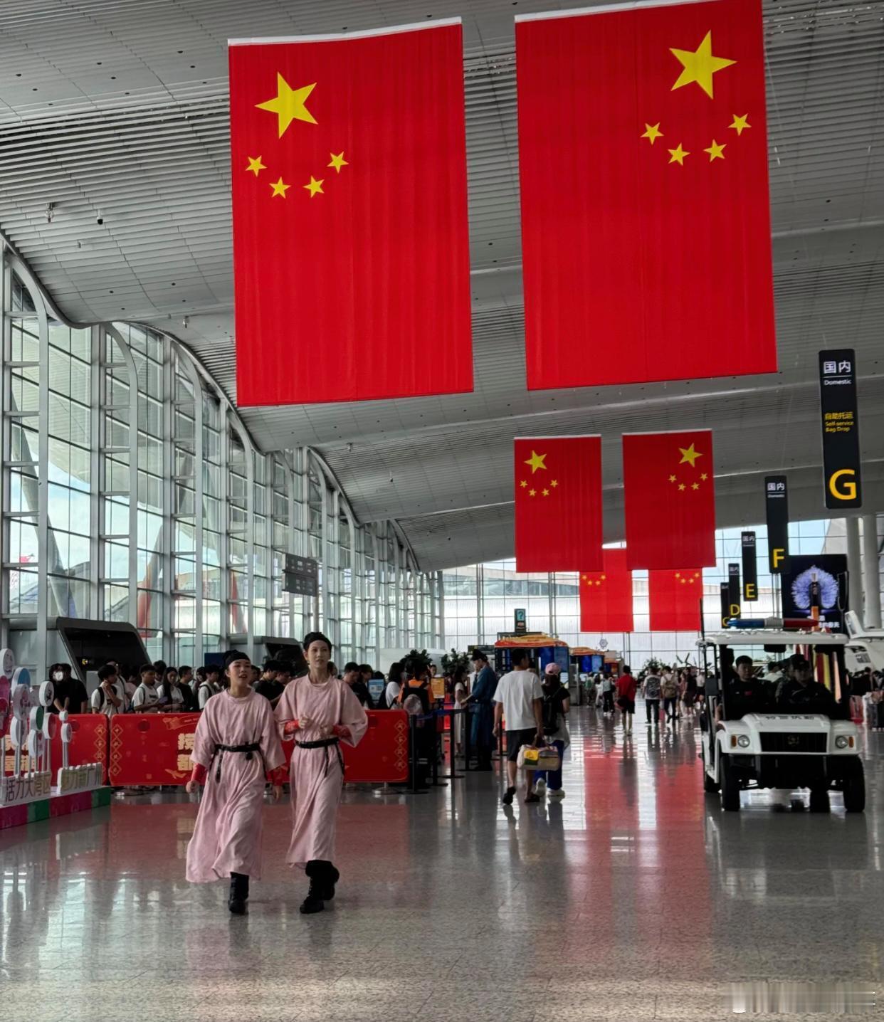 最绝的是,这些工作人员个个表情管理满分。据说千万别和他们对视,否则他们会破功笑场——但亲眼所见,他们举手投足都带着角色应有的气势,哪怕推着行李车的阿姨经过时都保持着端庄仪态。候机楼里红旗悬挂,现代旅客拖着行李箱与古装身影擦肩而过,这种时空交错感太奇妙了。
