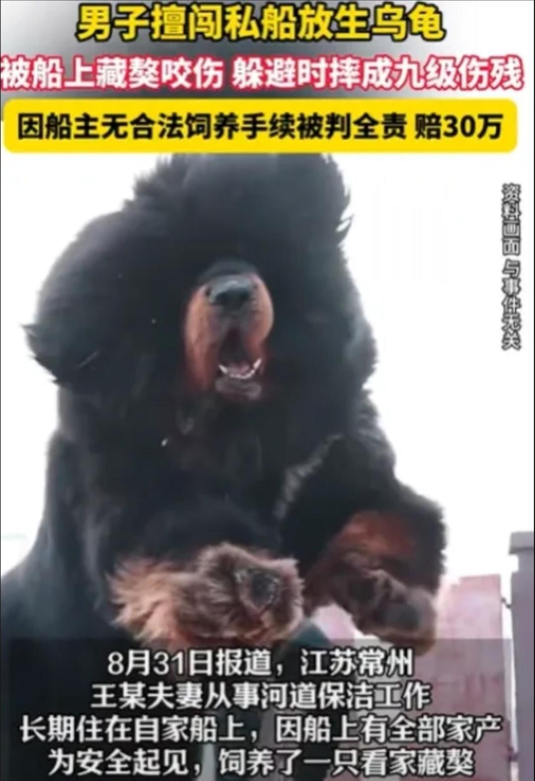 肆意妄为终酿祸!王某夫妇因工作需要常住船上,为保护家中财产,于是饲养了一头藏獒,并在船上悬挂“内有大型犬,非请勿入”的警示牌。 张某手提乌龟至河畔放生,因嫌弃岸边水质不佳,未经许可登上王某夫妇的船只。不料突遭藏獒攻击,在惊慌逃窜中摔倒,经鉴定构成九级伤残。事后,张某将王某夫妇诉至法院,索赔医疗费、误工费等共计30万元。 法院审理认定,尽管船上设有警示牌,但藏獒属于当地禁养的烈性犬种,二人既无合法饲养手续,也未采取有效防护措施,存在重大安全隐患,不能免除其法律责任。 最终,法院判决王某夫妇承担全部侵权责任,赔偿张某三十余万元。 判决结果公布后,在网上引起了广泛热议。有人认为狗主人理应对犬只伤人负责;也有人觉得只要狗未主动外出伤人,被咬者擅自闯入就该自担后果。 你如何看待这起案件的责任划分呢?欢迎评论区留言讨论![比心]