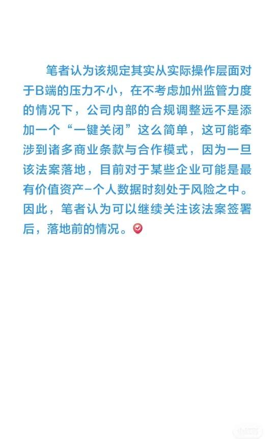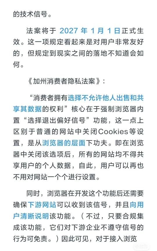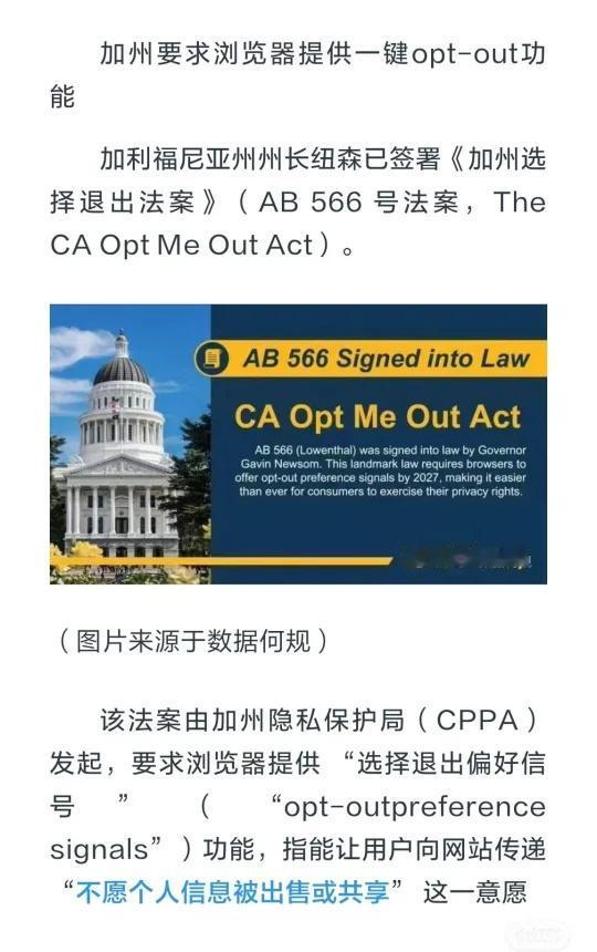 浏览器有变化?加州新法案引发讨论 加利福尼亚州州长纽森已签署《加州选择退出法案》(AB 566 号法案,The CA Opt Me Out Act)。该法案由加州隐私保护局(CPPA)发起,要求浏览器提供 “选择退出偏好信号” (“opt-out preference signals”)功能,指能让用户向网站传递 “不愿个人信息被出售或共享” 这一意愿的技术信号。 法案将于 2027 年 1 月 1 日正式生效。 笔者认为该规定其实从实际操作层面对于B端的压力不小,在不考虑加州监管力度的情况下,公司内部的合规调整远不是添加一个“一键关闭”这么简单,这可能牵涉到诸多商业条款与合作模式,因为一旦该法案落地,目前对于某些企业可能是最有价值资产-个人数据时刻处于风险之中。因此,笔者认为可以继续关注该法案签署后,落地前的情况。 数据保护 个人信息 加州 数据出境 法律实务 热点新闻事件 每天一个法律知识
