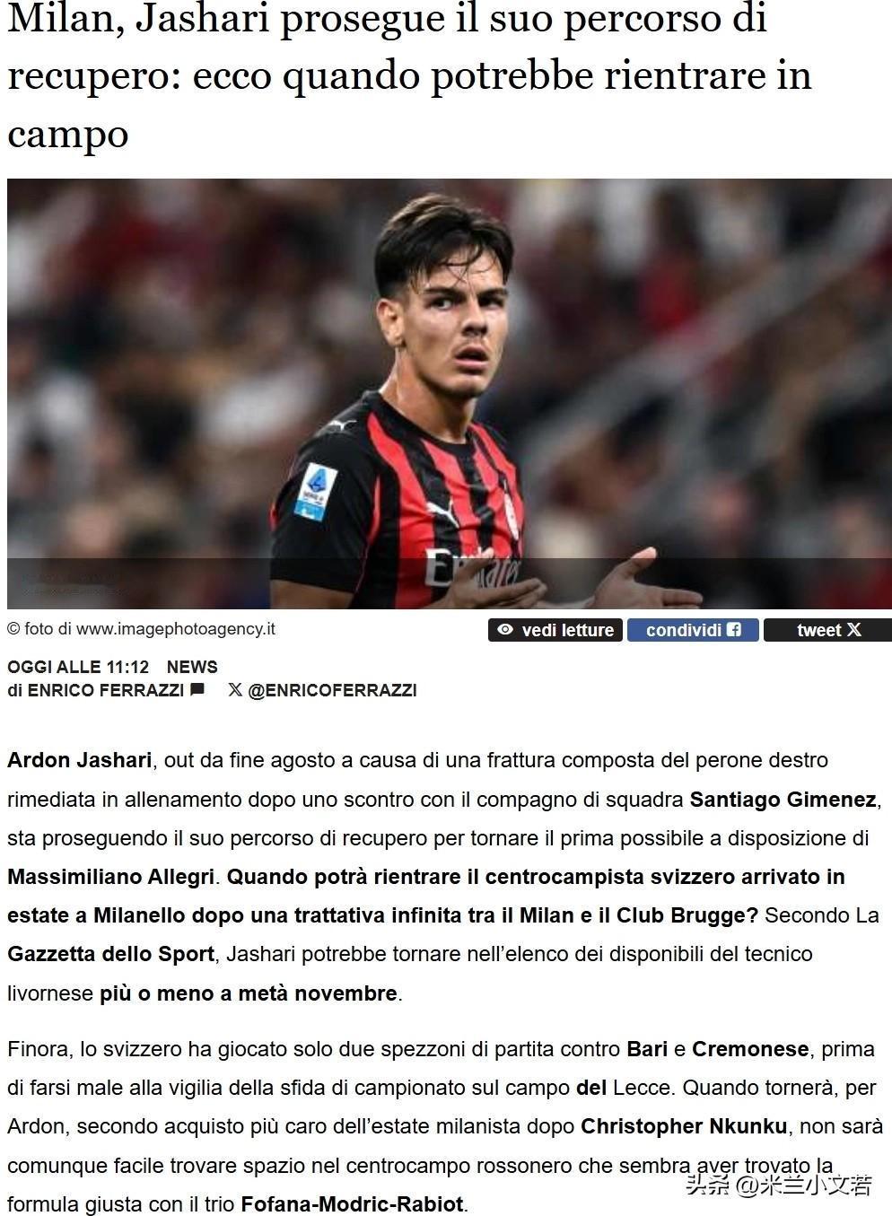 加沙里!右腓骨骨折的米兰中场球员加沙里伤病恢复不错,他可能在十一月中旬回到训练场,加沙里之前表示他期望可以在冬歇期之前回到球队。 加沙里正在米兰内洛基地执行定制化康复计划,力争尽快进入阿莱格里的可用名单。《米兰体育报》报道,球员可能将会在十一月中旬回归。请看好了是《米兰体育报》报道的,虽然不是新华社,但《米兰体育报》也是报纸,哪怕是厕纸也是一个市的报纸,不是我说的,我没造谣。 作为今夏继恩昆库之后米兰的第二高价引援,加沙里很想用好的表现回馈米兰俱乐部,之前加沙里在圣西罗观看米兰与那不勒斯之战后表示过,要想在莫德里奇、拉比奥与福法纳坐镇的中场争得一席之地,真的很难,这是严峻的挑战。 加沙里在布鲁日位置是边中场,一直都是左路,就是今天拉比奥特的位置,拉比奥特他真的没法竞争,单线作战轮换可能性真的不大,所以这个位置确实难,加沙里之前在瑞士出道也打过后腰,米兰现在的后腰是莫德里奇,加沙里竞争的可能性更低,所以确实是严峻的挑战。