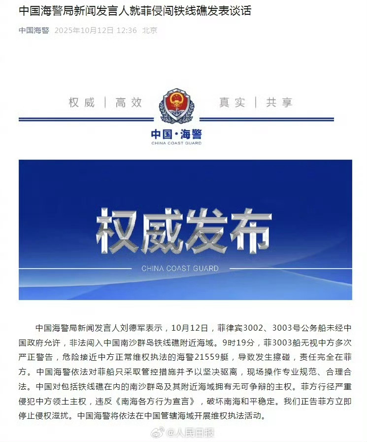 【中国海警局新闻发言人就菲侵闯铁线礁发表谈话】#中国海警依法管控驱离菲船只# 中国海警局新闻发言人刘德军表示,10月12日,菲律宾3002、3003号公务船未经中国政府允许,非法闯入中国南沙群岛铁线礁附近海域。9时19分,菲3003船无视中方多次严正警告,危险接近中方正常维权执法的海警21559艇,导致发生擦碰,责任完全在菲方。中国海警依法对菲船只采取管控措施并予以坚决驱离,现场操作专业规范、合理合法。中国对包括铁线礁在内的南沙群岛及其附近海域拥有无可争辩的主权。菲方行径严重侵犯中方领土主权,违反《南海各方行为宣言》,破坏南海和平稳定。我们正告菲方立即停止侵权滋扰。中国海警将依法在中国管辖海域开展维权执法活动。#菲律宾派出的挑衅船只越来越多#