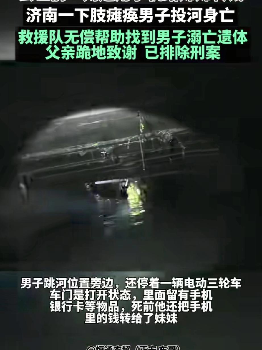 济南一下肢瘫痪男子投河自尽,去世前一刻还用手机给妹妹转钱,猜测男子走向极端的最大原因,是因不能自理不愿再连累父母,活着没了指望一个人的意念彻底绝望,自尽的想法想了又想,不知碾转多少个日夜才下定决心鼓足勇气走向这条不归路! 父亲看到被打捞上来的遗体悲痛欲绝,看这位给救援队下跪的父亲也就60岁以下,试想下肢瘫痪的儿子很年轻,正因年轻而不能自理放弃了活的希望,在男子的世界投河自尽也许是一种解脱,以后活的再也不用这么累了!不知他的选择到底是对还是错?