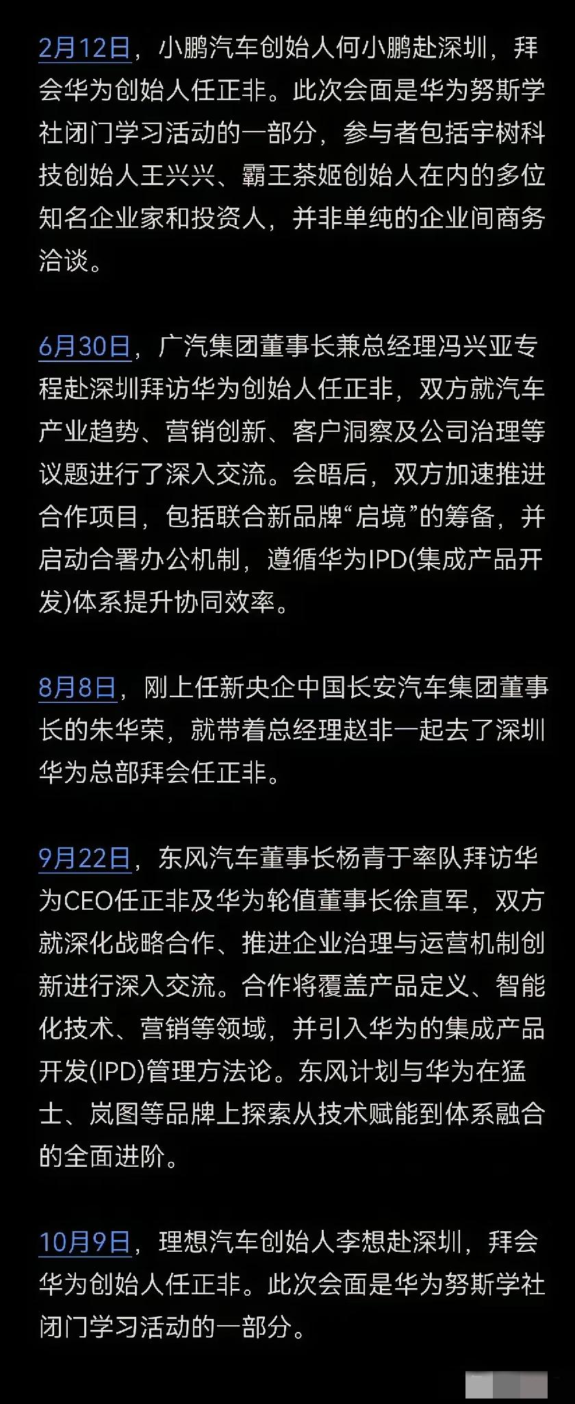 李想去拜访任正非了,这已经是今年第五位造车企业家去拜访任总了,说明什么?车企大佬"排队"访华为:智能汽车时代的价值锚点 当理想汽车创始人李想的身影出现在华为深圳总部,与任正非的闭门会谈被曝光,这位今年第五位拜访华为掌门人的造车企业家,再次将行业目光聚焦于这场跨领域的交流热潮。从何小鹏到冯兴亚,从朱华荣到杨青,车企大佬们的"集体朝圣",绝非偶然的礼节性拜访,而是智能汽车产业变革期的必然选择,折射出行业发展的深层逻辑。 这场拜访热潮首先印证了智能化已成为车企竞争的核心战场。传统造车比拼的是发动机、底盘等机械素质,而智能汽车时代的核心竞争力转向智能驾驶、智能座舱与智能车控的技术突破。华为通过引望智能公司构建的技术体系,已在行业形成差异化优势——广汽斥资15亿成立华望汽车,正是为了嫁接华为的智能化能力;东风猛士与华为合作的M817车型,预售1小时近万辆的成绩,更印证了市场对"科技+制造"组合的认可。车企大佬亲赴华为,本质是为获取智能化转型的"技术密钥"。 更深层的原因在于企业治理与生态能力的跨界渴求。任正非与车企掌门人的交流,早已超越单一技术采购的范畴。东风汽车在会谈中明确提出引入华为IPD管理方法论,将合作从技术层面延伸至企业运营体系;朱华荣拜访时既探讨产业格局,又对接徐直军、余承东落实合作细节,体现了从战略到执行的全维度需求。在新能源汽车渗透率快速提升、行业竞争白热化的当下,华为在研发管理、供应链韧性与客户洞察上的经验,成为车企突破增长瓶颈的重要参照。 这种双向奔赴更凸显了产业生态协同的必然趋势。智能汽车的复杂性远超传统车型,单一企业难以覆盖全产业链的技术攻关。华为与车企的合作模式不断进化:从阿维塔的Hi Plus模式,到广汽"华为智能化+广汽智造"的创新路径,再到东风猛士的品类共创,形成了优势互补的生态格局。任正非强调"汽车行业的根本是要把车造好,车的最高级别就是安全",这一论断为合作定下务实基调,让技术赋能不偏离造车本质,这种价值观共识正是生态协同的基础。 值得关注的是,竞争边界的模糊催生了开放合作的行业共识。小鹏汽车曾与华为在技术领域有过公开争论,但何小鹏拜访后直言收获"无私的建议",随后双方联合打造AR-HUD技术并实现量产。这种"竞争中合作"的姿态,打破了传统行业的零和思维。在智能座舱、车路协同等共性技术领域,封闭发展只会延缓创新速度,车企大佬们的主动拜访,彰显了对开放生态的集体认同。 从行业发展周期看,这场拜访潮标志着中国智能汽车产业进入高质量发展的关键转折期。当新能源汽车从"电动化"的上半场迈入"智能化"的下半场,企业需要跨越技术、管理与生态的多重门槛。任正非及其领导的华为,既掌握核心技术,又具备穿越产业周期的经验,自然成为车企在转型迷雾中的"价值锚点"。 李想的到访为这场年度交流热潮画上阶段性句点,但车企与科技企业的协同创新才刚刚起步。智能汽车的竞争最终是生态与体系的竞争,当越来越多的造车力量主动拥抱跨界合作,中国汽车产业必将在全球智能出行变革中占据更核心的位置。这场"排队"拜访的背后,正是一个产业迈向成熟的清醒与自觉。