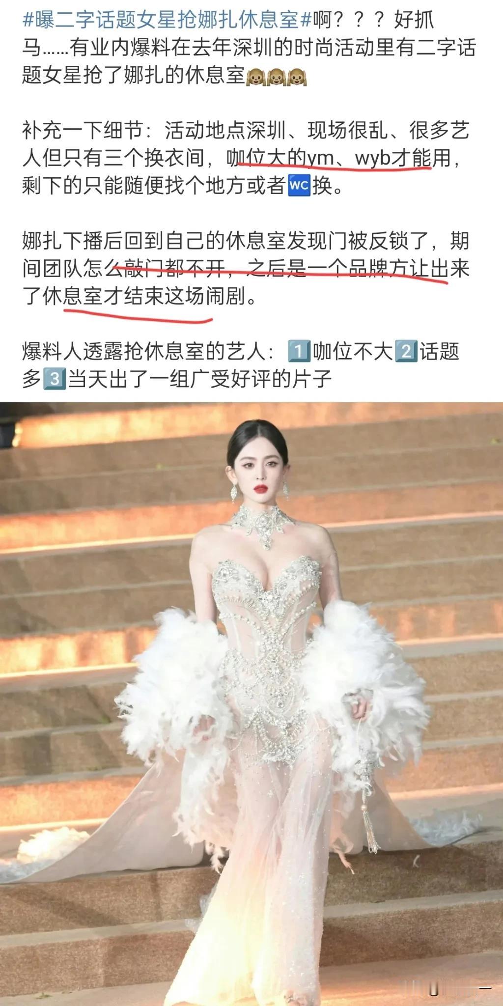 不得不说毯星是真咖位不行啊 红毯上美艳绝伦的娜扎竟然被爆被抢休息室,只有杨幂、王一博才有专属 这一则爆料一出网友一边说这么多明星参加就三个休息室,主办方未免太小气了 还有光鲜靓丽的明星 私下也爱扯头花啊,还爆料说是某二字女明星抢的,这下和她一起走红毯的二字女星周也、林允、那然等都被猜了个遍了[捂脸] 主编刘冲倒是回复说:“是谣言”,不过网友还是猜了一片,你们怎么看呢?