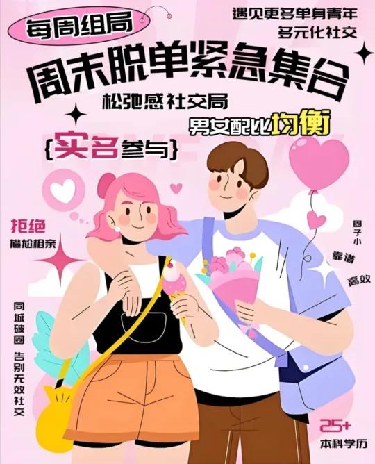 牛马周末脱单局!非单身勿进! 每天被工作 “CPU” 到只想躺平,哪有空找对象? 别让 KPI 偷走你的爱情! 📣 呼叫孤寡选手!周末速来集合! 🎾加入我们,主题盲盒每周不重样 露营🏕️/ 骑行🚴/ 剧本杀🎭/ 手作 DIY🎨/ 微醺派对🍷… 100 + 玩法,每个周末都有新期待 让你在玩闹中遇见灵魂共振的 Ta,从此告别 “无效社交”! 1:1 科学配比,势均力敌才能碰撞出火花~ 🌿实名认证 真实靠谱××拒绝动机不纯 ⚠报名条件: 年龄25+ 单身状态 专科以上学历 💬戳评论区【立即参与】在2025结束前谈场恋爱吧~年轻人的社交新方式 线下活动 交友
