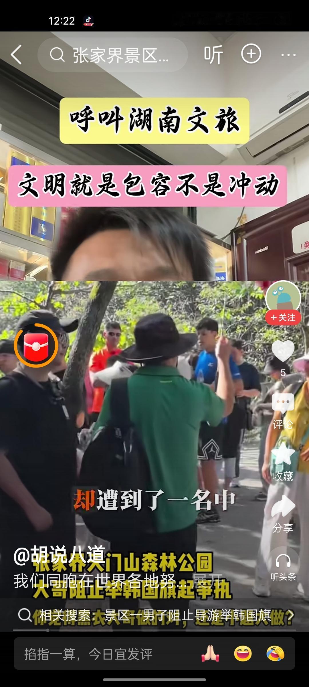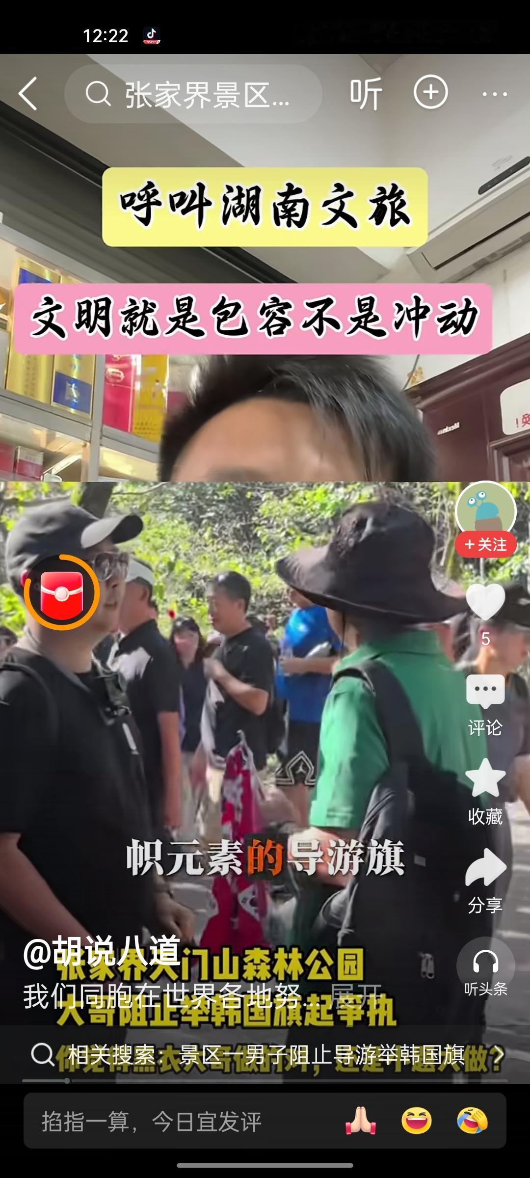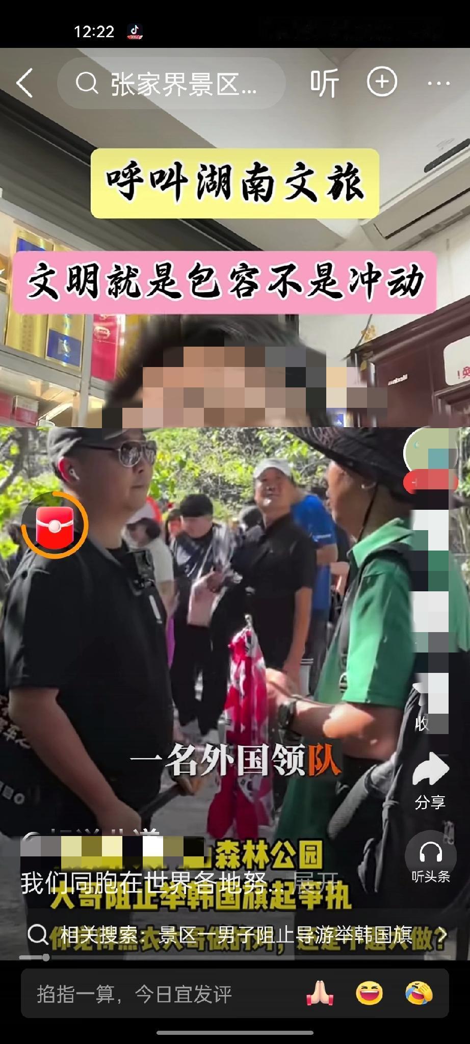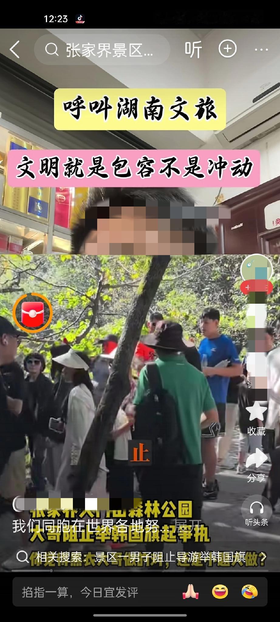 理性爱国不好吗? 10月7日张家界景区发生了一件事,有位黑衣男子堵住了导游,他认为导游手里的旗帜是韩国国旗,所以必须收起来。看起来好像是爱国行为,尽管导游解释了只是旅行团旗帜,用来召集和引领韩国游客的,那也不行! 其实近几年出现不少这种人,网上大V如 哈马南等人,善于挑动情绪。也有一些想吃这碗饭的小人物,比如因为敲诈被抓的铁头,去外蒙宣示主权被打掉七颗牙的、还有看见红瓶盖就发飚的战马。这些人实际上跟1百多年前的拳民,没什么区别。 他们根本就不是爱国,就是为了流量,为了带货。国家的形象就是被这种人败坏了!