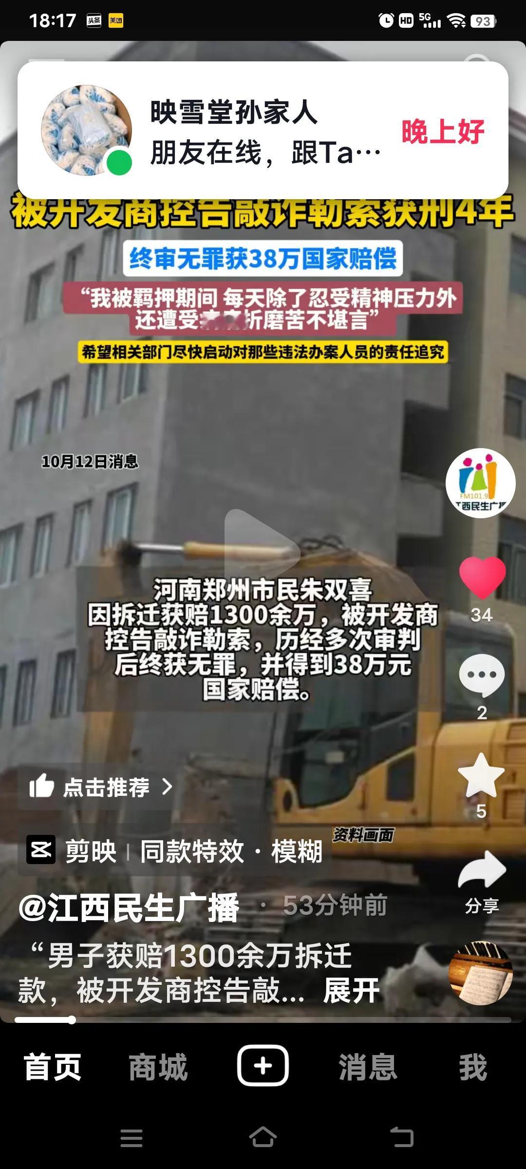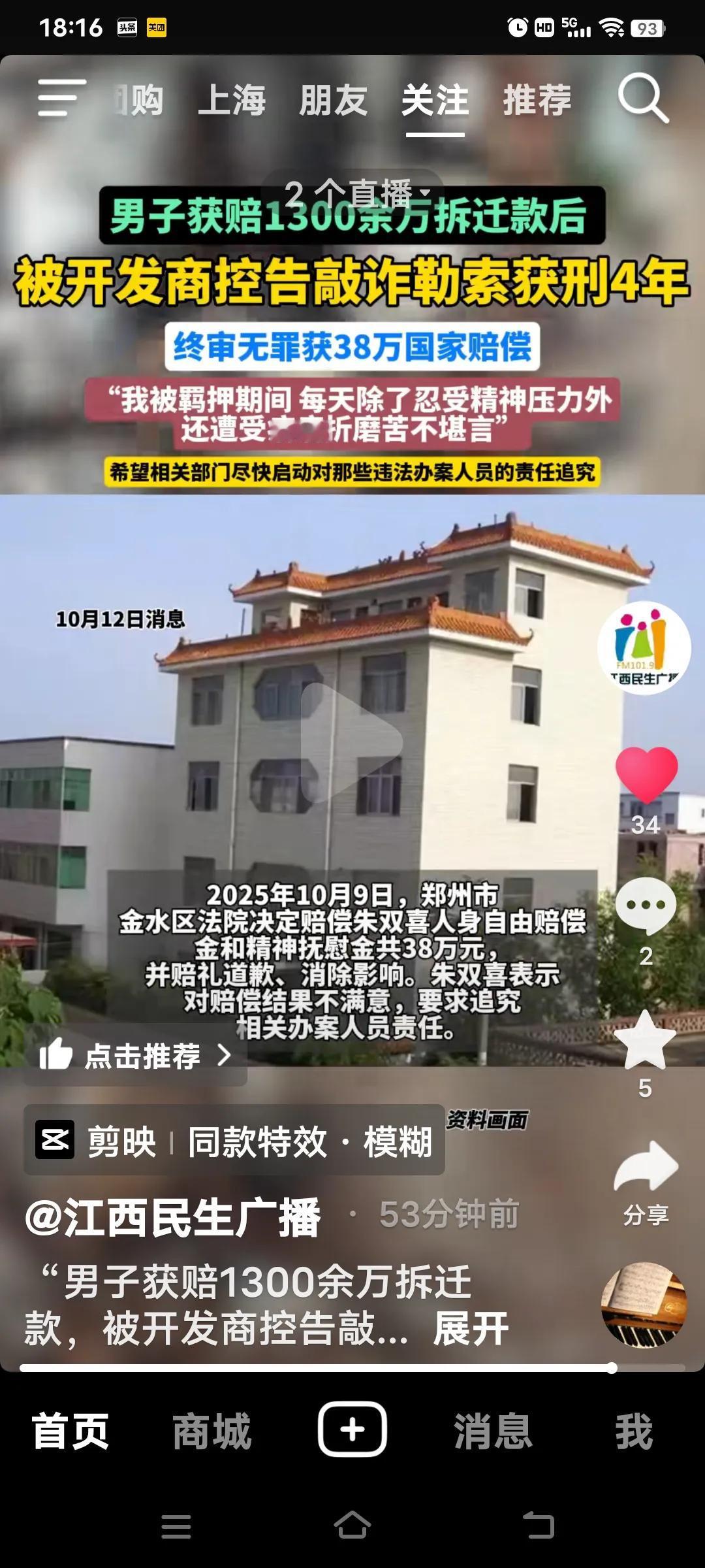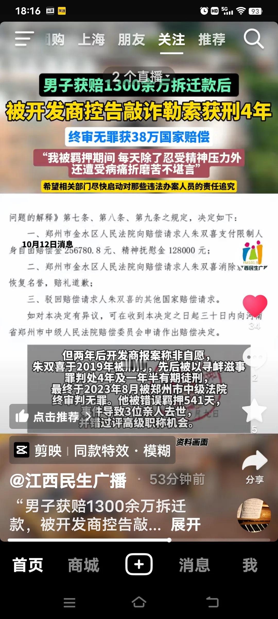 河南郑州的朱双喜实在是太冤了,在获得 1300 万余元的赔偿后,竟被指控敲诈勒索,获刑 4 年。 2017 年,开发商主动找他签订协议,还出具了自愿支付 1300 余万拆迁款的承诺书。然而到了 2019 年,开发商却报警称他敲诈勒索。 朱双喜被抓后,一审被判处 4 年刑期,上诉后二审发回重审,第二次判决为 1 年半,他再次上诉,直至 2023 年 8 月才终审无罪。他被关押了 541 天,身体也落下了毛病。他家有 3 名亲人相继离世,他还错过了评高级职称的机会。 2025 年 10 月 9 日,郑州市金水区法院决定给予朱双喜人身自由赔偿金和精神抚慰金 38 万元,并赔礼道歉、消除影响。 朱双喜表示对赔偿结果不满意,他坚持追究办案人员的责任,这事确实该有个说法。这也太离谱了,拆迁款是开发商自愿给的,凭什么告人家敲诈勒索?这怎么能行呢!换做谁都会追究,仅仅赔礼道歉怎么能了事,别把老实人当傻子耍! 朱双喜