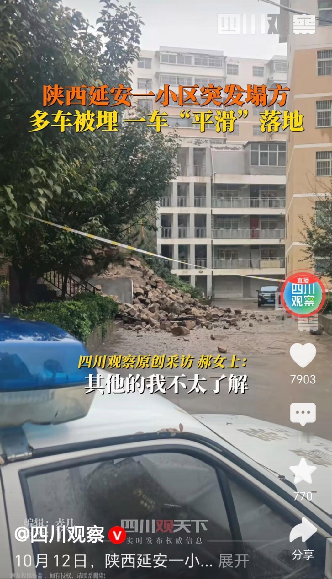 10月12日,陕西延安宝塔区丰泽园小区突发路基塌陷滑坡,一处石坡的护坡墙被垮塌泥