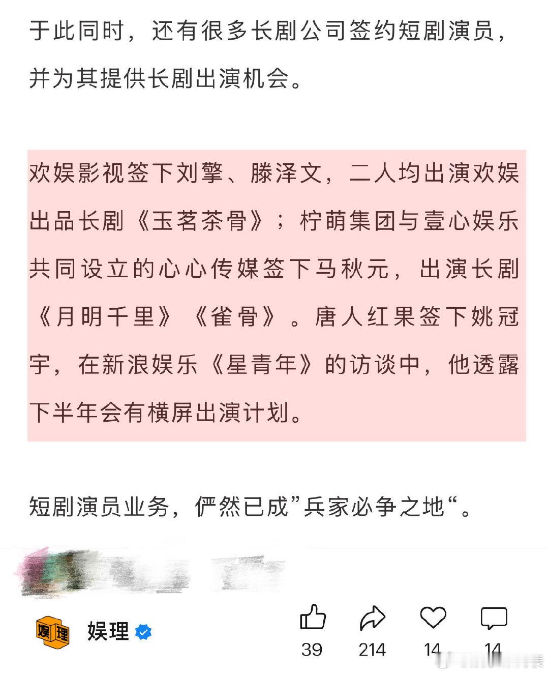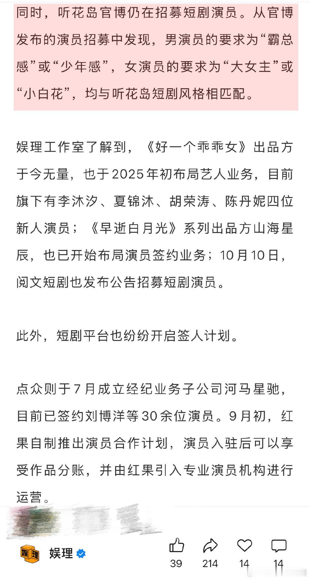 业内称短剧演员演长剧的意愿不高 短剧男演员想和刘萧旭合作 曾拥有王格格、刘萧旭等头部演员,马厩、赤兔两大制片厂的星链无限,于2025年主动舍弃了艺人经纪业务。据观察,目前星链无限已不做演员经纪业务,专心做短剧出品。或许如当年正午阳光放弃艺人业务一般,独立运营能更好各自发挥优势,效益更大化…娱理独家↓