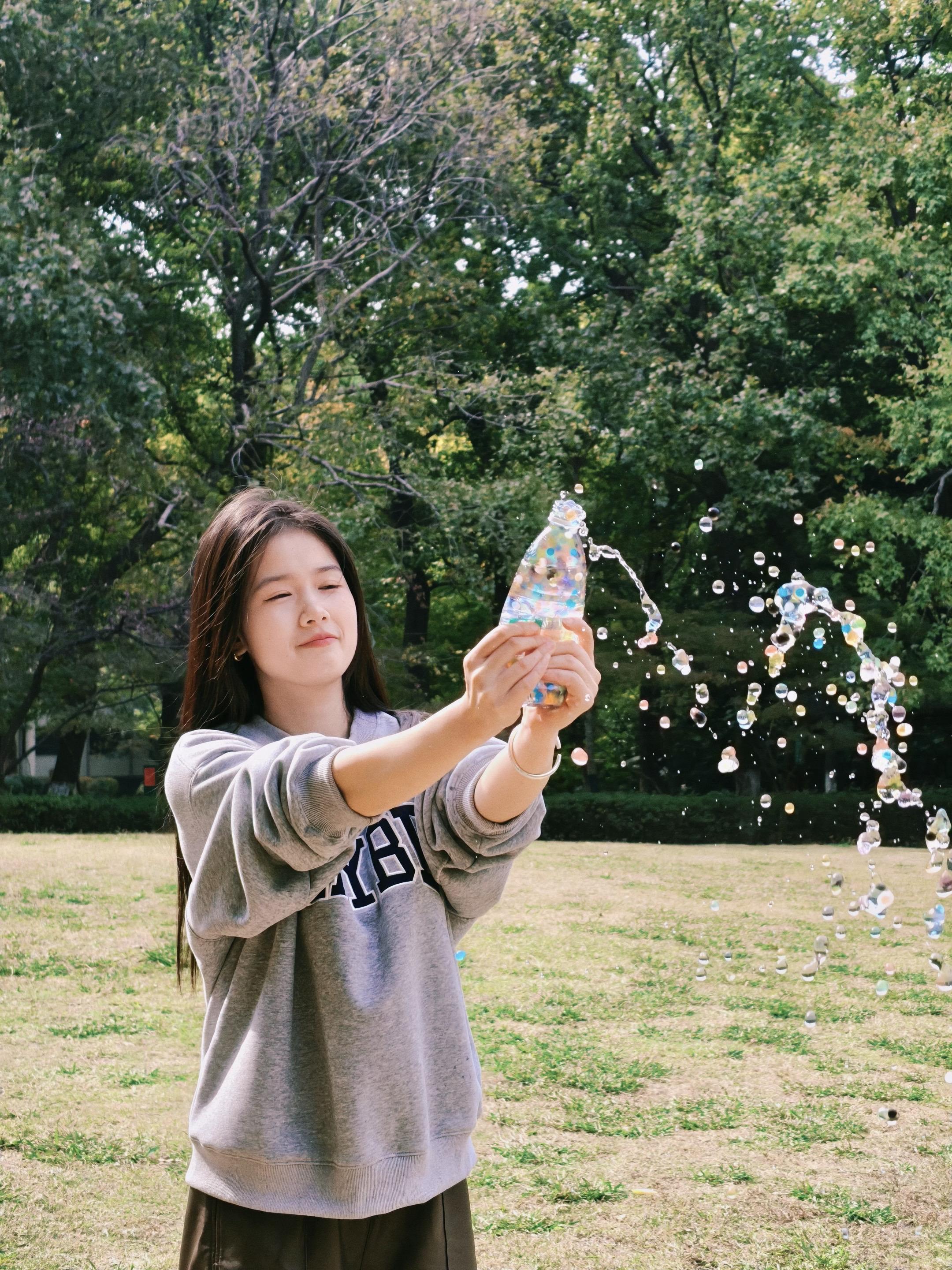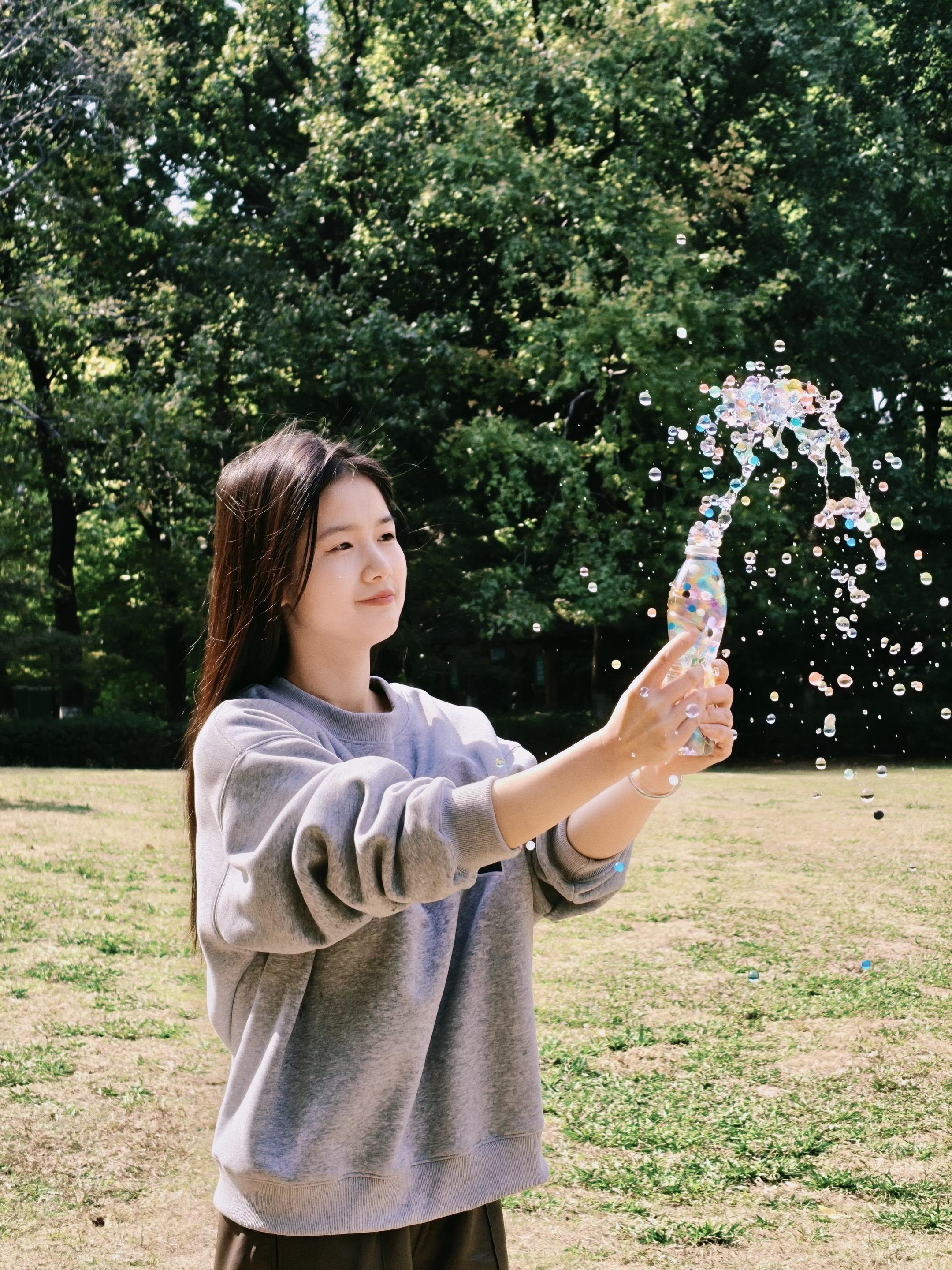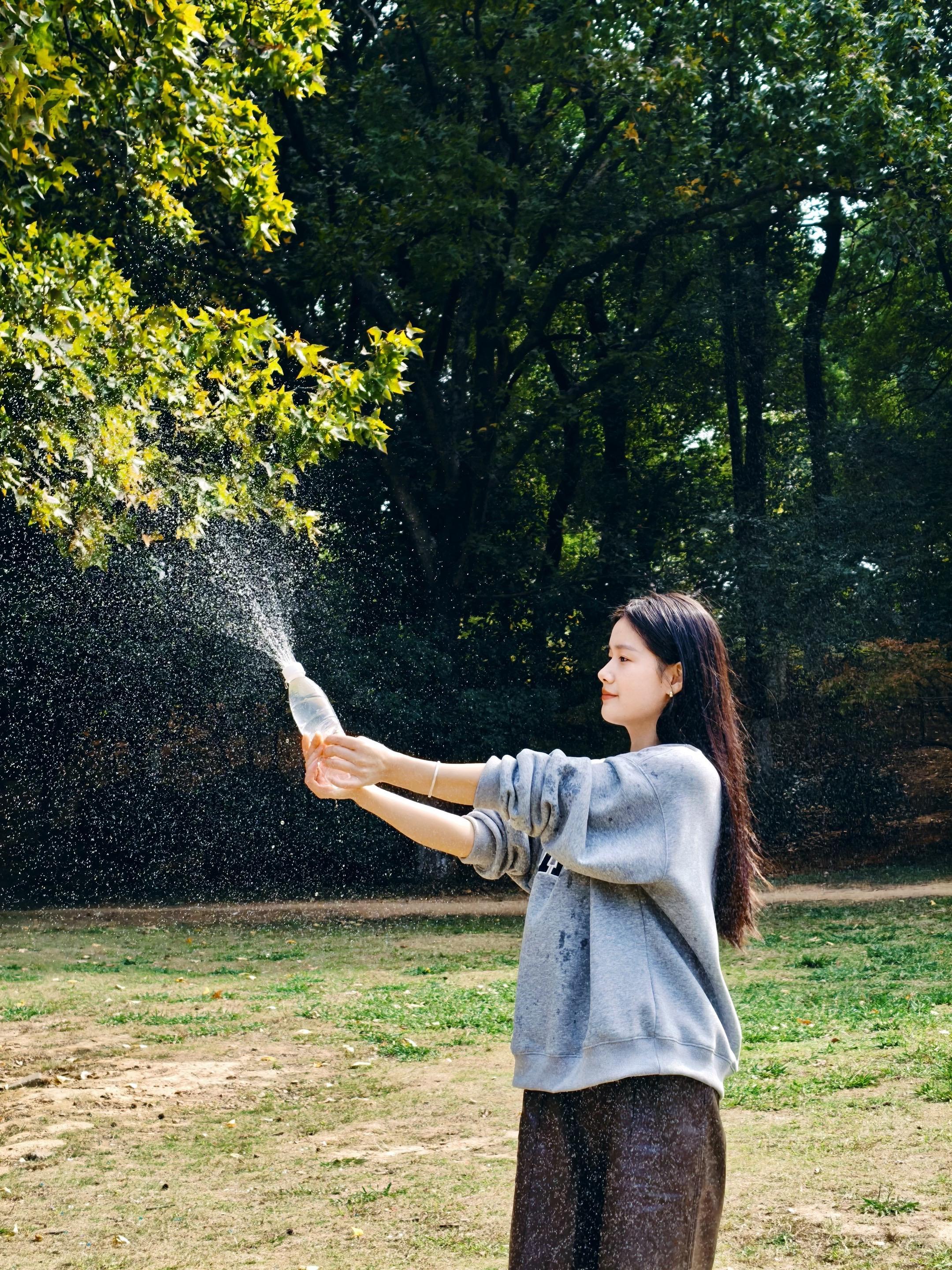 - 举高瓶子快速挤压瓶身,让水呈喷射状洒出,同时配合大笑、甩头这类活泼动作,抓拍动态感;