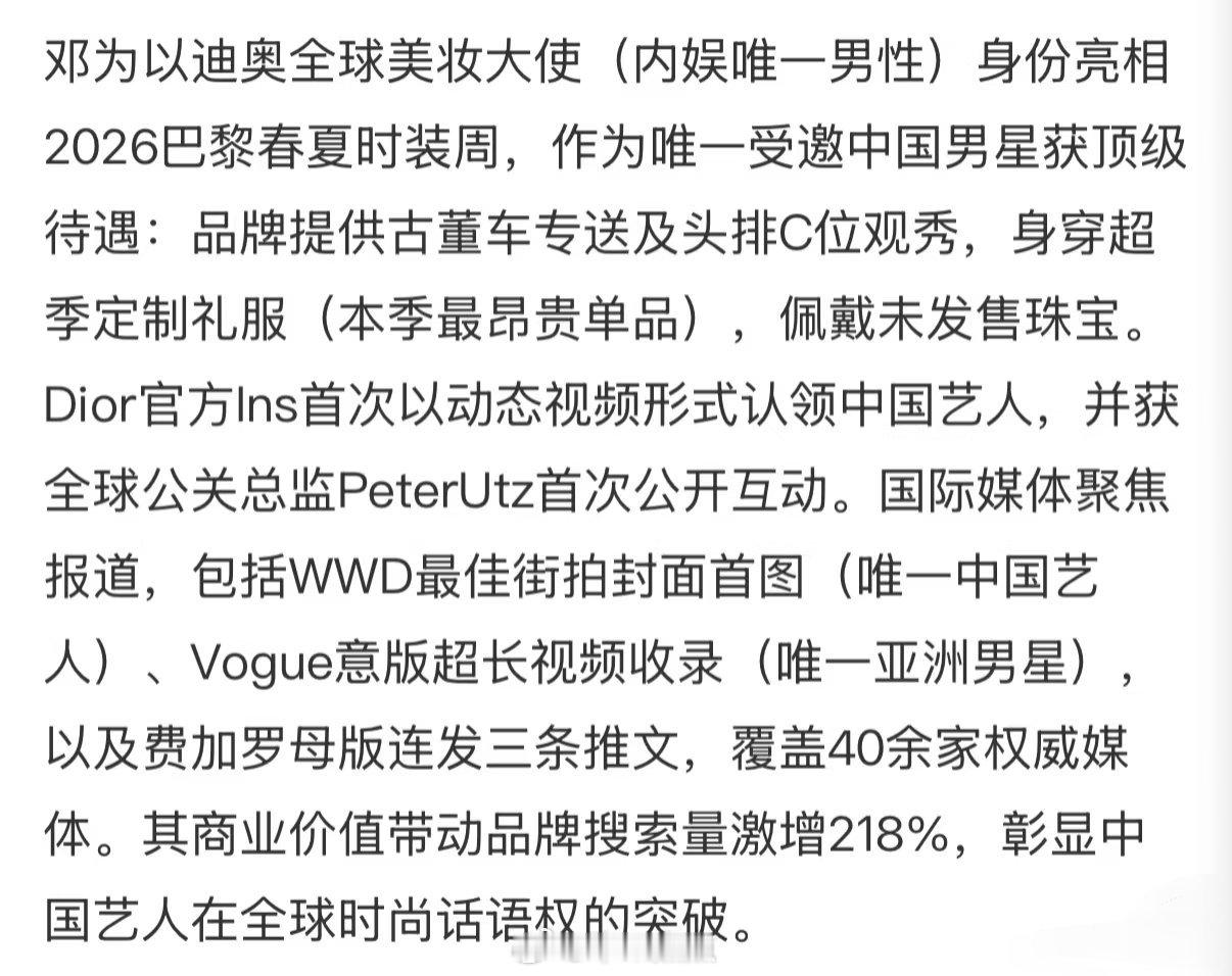 巴黎时装周,邓为获近40家国际顶级媒体关注,媒体报道多到一页放不下!这还只是目前能查到的…基本都是世界各地顶级媒体或顶级时尚刊物收录和报道,这星光、规格和排面实属中雕之最~再度拿下星品影响力第一,名副其实闪耀巴黎。邓为不单单是长相帅,是艺术气质和时尚品味,美商超高,时尚界就是会很敏锐的捕捉这种自带星光的人