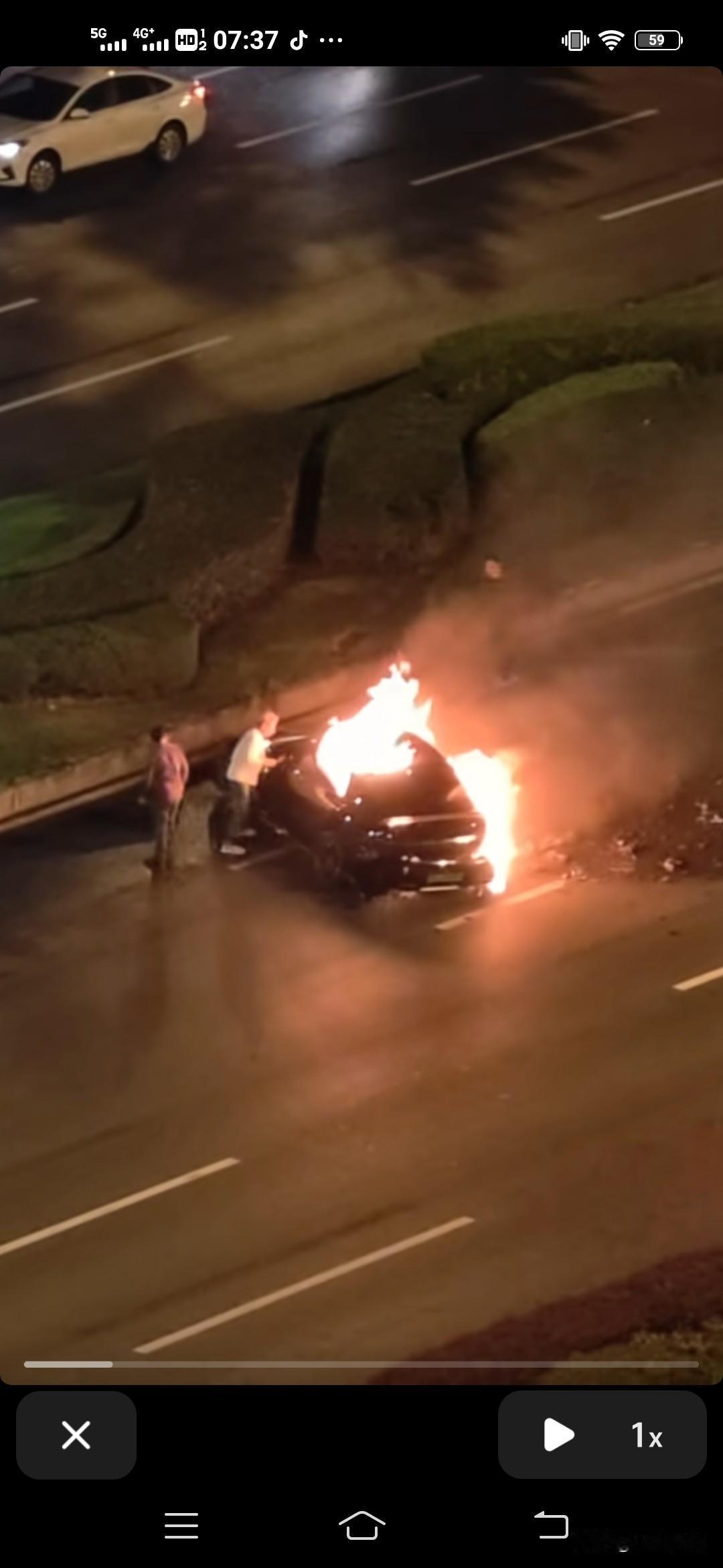 救人的小伙子他已经拼尽全力想救他,手上的血都往下流了,社会小哥,心地真的善良,用肘击玻璃窗,先生大义 门打不开,周边也没有个大石块什么的,几个小伙子徒手破窗救人太不容易了,最终没成功,太可惜了 烧没了,听到男司机惨烈叫声,人没出来,车门开不了。电释放把手一旦出事里外都打不开,原视频一下就冲出去了,起码150➕,听说还是追尾➕翻滚。不得不说,这车还是用了好质量的配件,就是这玻璃硬的,连施救都不能了。 最大的问题,就是太智能。只能到一定程度,外界力量都很难进入到它的程序当中。这个看多了,车上备了一根撬撬棍 ,就是为了这种情况扔出去 的。