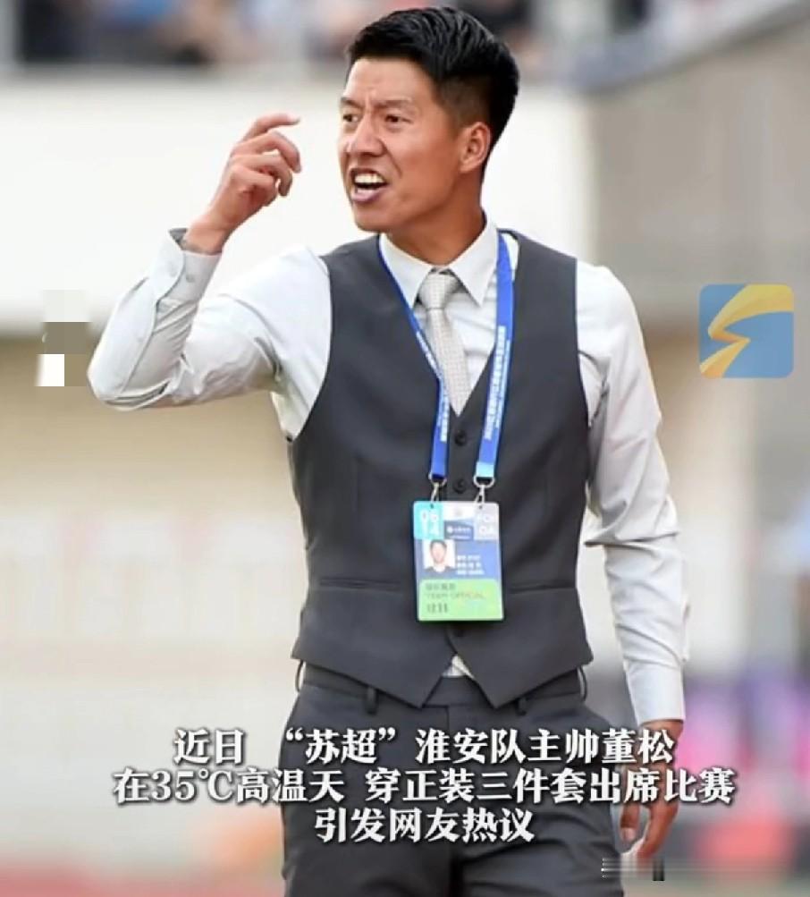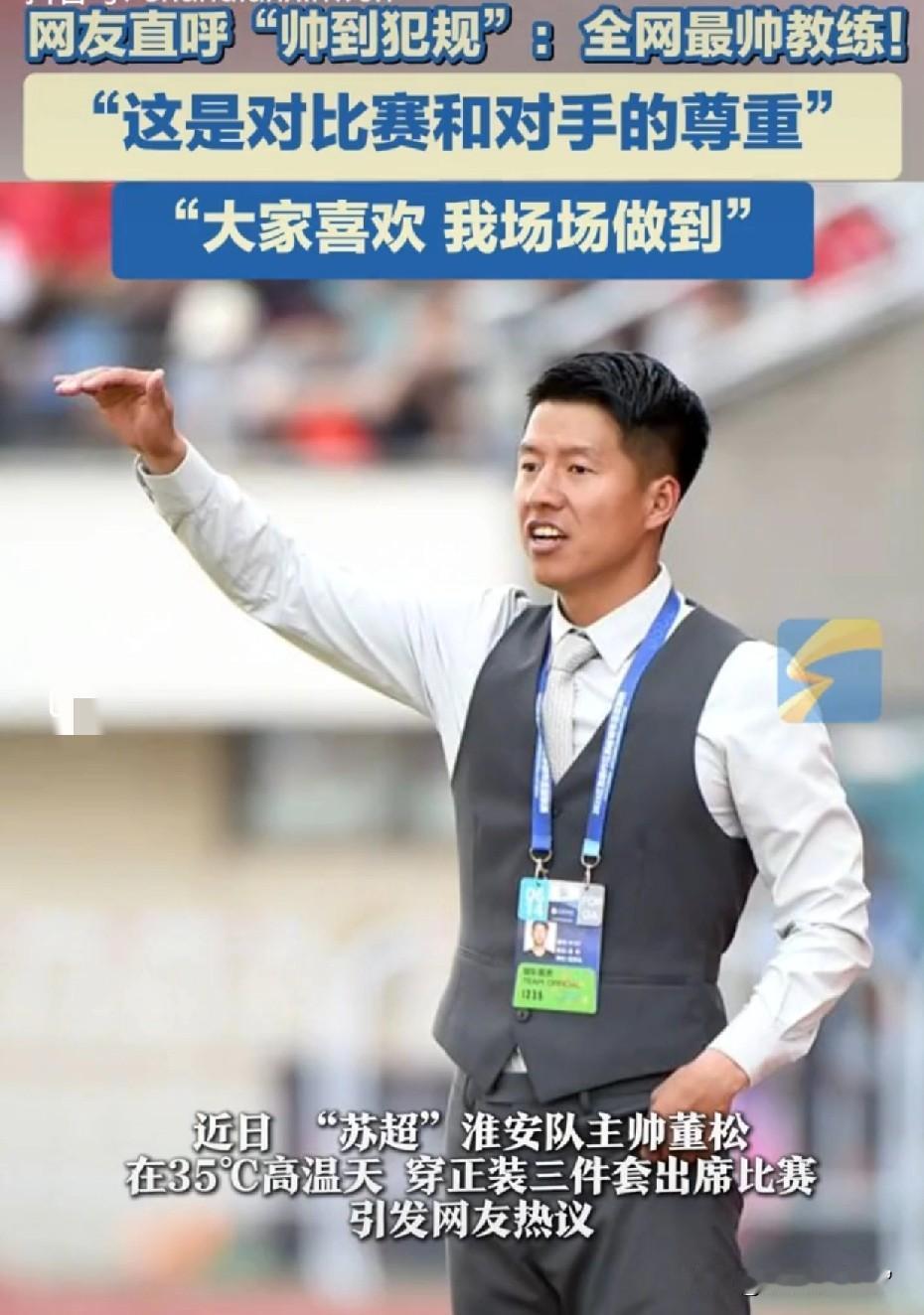 苏超最帅主教练出炉:淮安队董松! 当然这句话不是我说的,而是抖音官方说的,他因在比赛中身穿西装指挥的形象和场边各种激动的表情受到关注,更有网友戏称他为"撒贝宁淮安分宁"。 不知道大家有没有注意到一个细节,董松在赛前都会穿着短袖,而到比赛时就会穿上帅气的西装。 有人质疑他,大热天的穿西装打领带属于哗众取宠,面对这一疑问董松在接受媒体采访时给出解答:“每一场比赛观众很多,要展示出精神最饱满的一面,也是尊重比赛,尊重对手。” 每次只要有淮安队的比赛,董松的表情绝对是一大亮点,有心急,有高兴,大喊大叫,恨不得自己上场,真是操碎了心。 虽然淮安队止步八强了,但是“浪里马”这个夏天带给我们太多惊喜。希望明年能取得更好的成绩! 大家对此怎么看?苏超淮安队 江苏苏超 苏超观赛