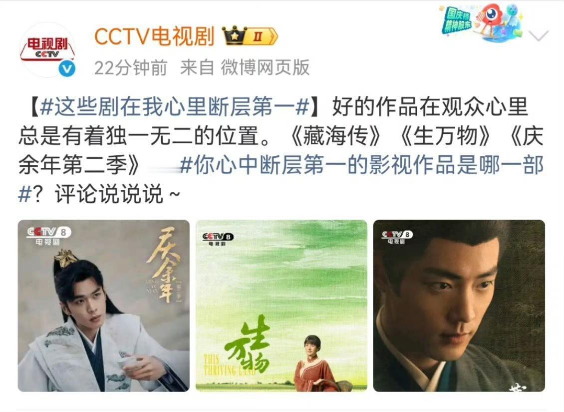 这三部剧上榜了, 符合你心目中“央视认证断层第一”电视剧不? 来唠五毛钱三个剧出圈的点, 虽然《庆余年》明显感觉第二季剧情不如第一季, 但当时播出时确实炙热, 体裁太新了又穿越又科幻还有仿生人。 《生万物》作为群像剧成功, 尤其大脚娘火了一把让人关注到老戏骨。 《藏海传》里有肖战还是郑晓龙的作品, 含金量就不多说了吧。