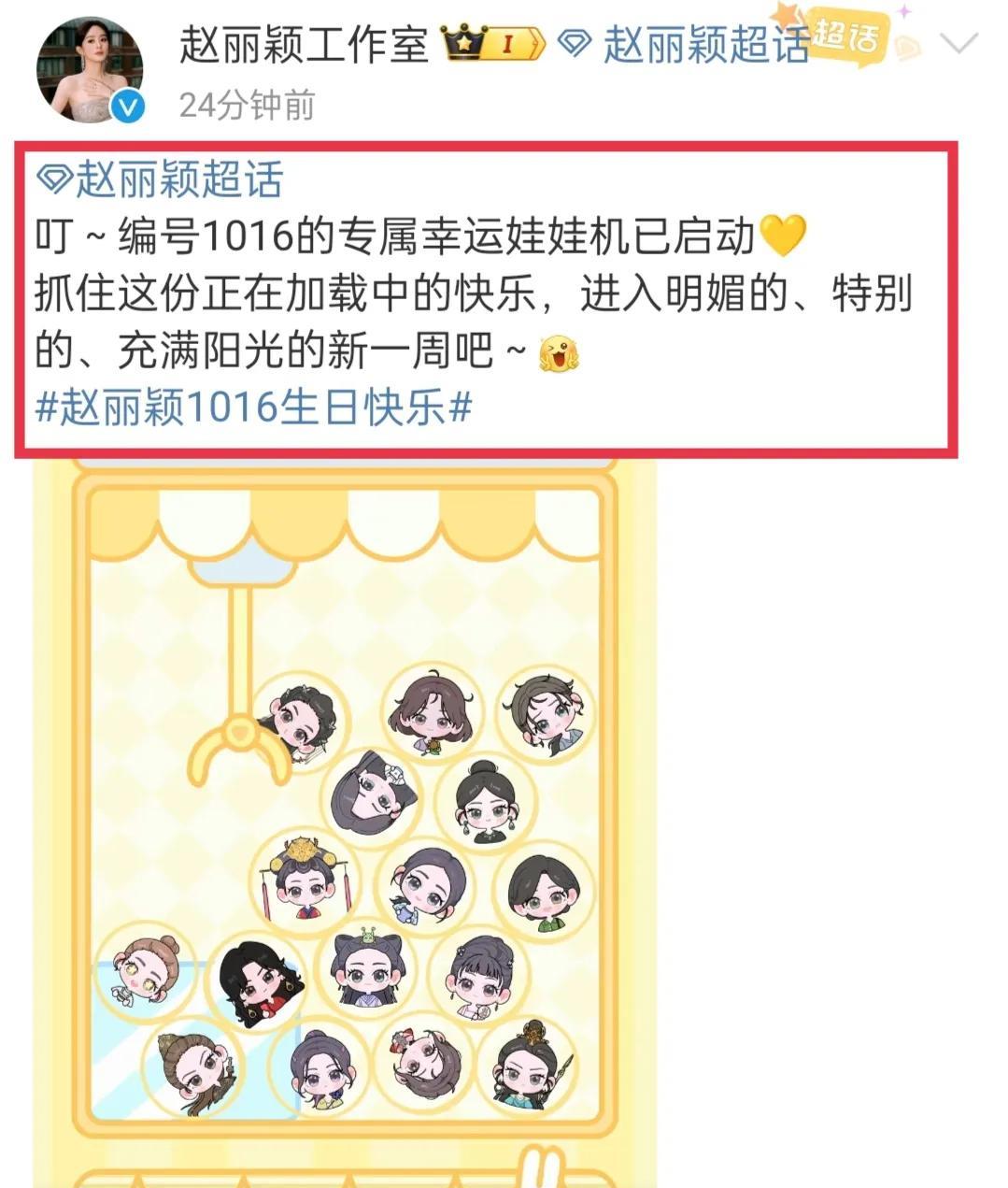 哇塞赵丽颖工作室周一营业好有创意呀!是颖宝各个角色的抓娃娃视频诶,好有新意呀!10月13日,赵丽颖工作室发博:“叮,编号1016的专属幸运娃娃机已启动!抓住这份正在加载中的快乐,进入明媚的、特别的、充满阳光的新一周吧!”好滴已收到,颖宝周一快乐呀!一切都顺顺利利的! 嘿嘿嘿看到丽室的IP变成了上海,这是不是说明颖宝要正式开工啦?还有丽室可能已经开始了颖宝这次1016生日策划!给丽室加鸡腿,这次周一营业真有创意呀!丽室请继续保持住呀!哈哈哈真开心,有盼头了!视频最后出现了颖宝的自拍照诶,嘟嘟嘴颖宝就是最萌的!非常期待颖宝这次生日策划呀!期待颖宝早日进组呀!那颖宝我们今晚直播活动见呀!