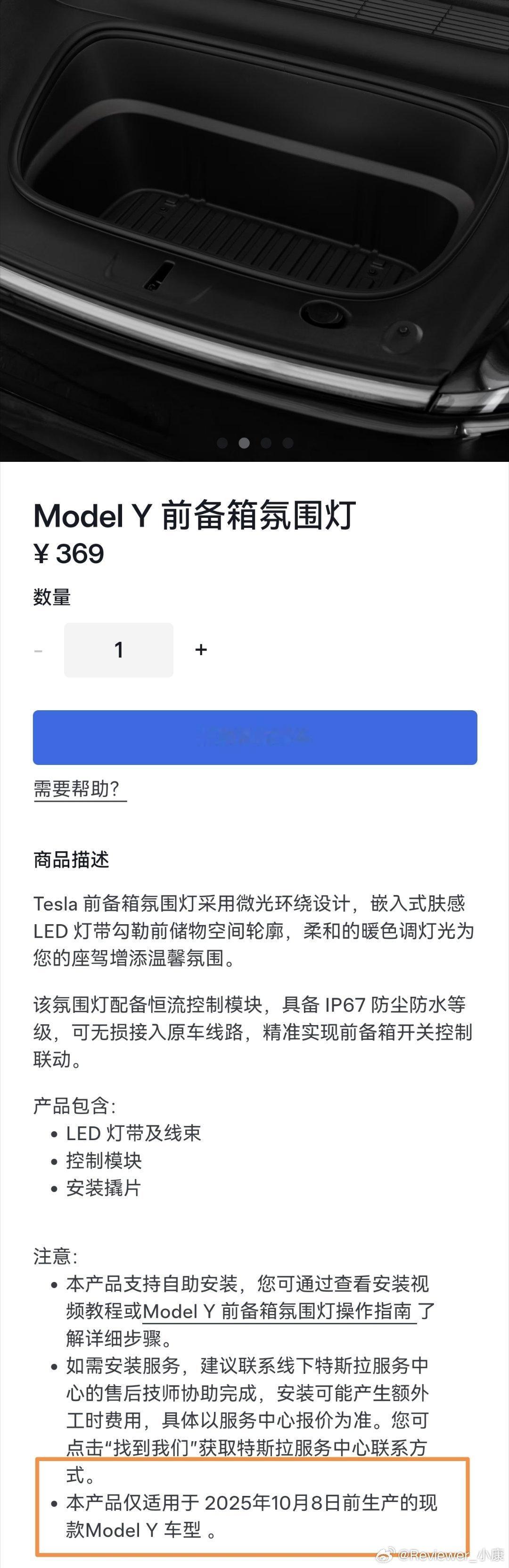 众所周知,Y的前备箱没有照明,所以提供了加装方案。不过详情页最后一句话,注明了“仅适用于2025年10月8日前生产的车型”。