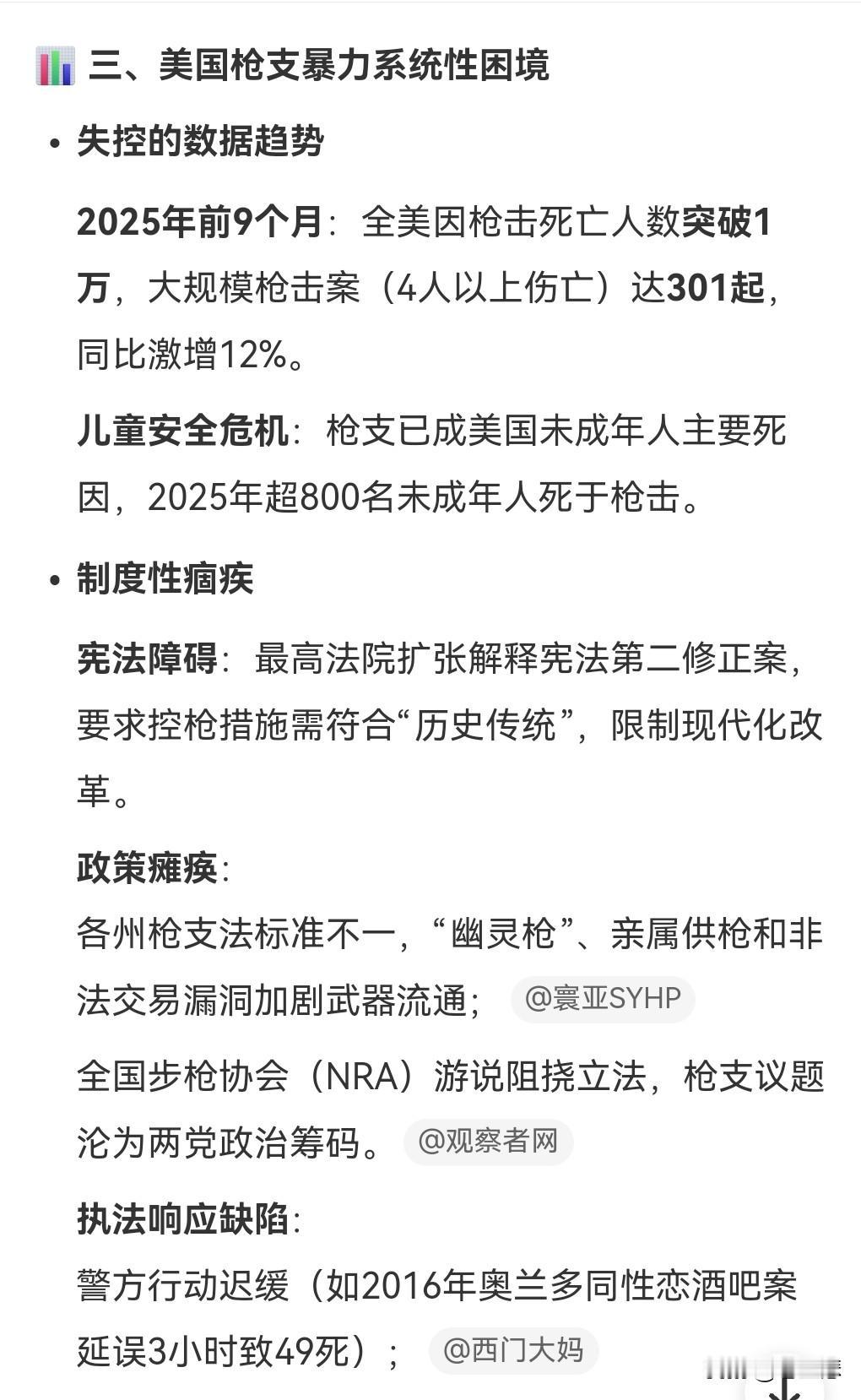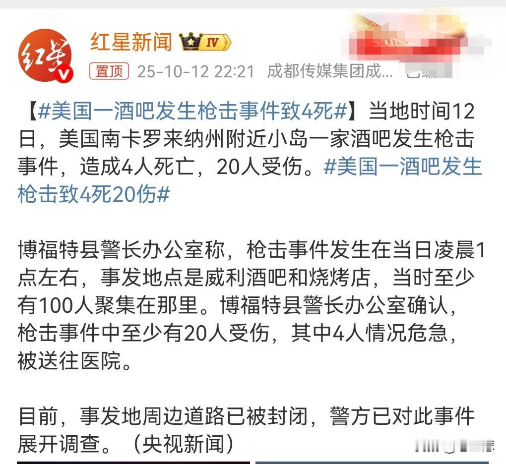 美国人民真是生活的水深火热之中,那里的治安实在是太差劲了,这是让人提心吊胆啊。 当地时间12日,美国一酒吧发生枪击事件致4死,20人受伤。 当时酒吧聚集了很多人,成为了凶手的目标。 令人瞠目结舌的是2025年前9个月,总共有超过1万人死于枪支暴力。 这真是让人瑟瑟发抖。 所以这就是不禁枪的后果,美国的枪支暴力犯罪已经愈演愈烈。 治安已经越来越恶化了。
