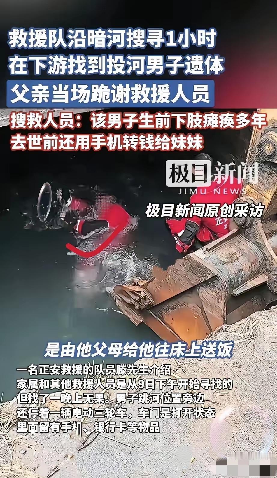 轮椅投河的背影里,藏着多少人不敢说的“拖累恐惧” 你敢信吗?一个连起身都要靠父母的瘫痪男人,最后时刻竟把手机里仅有的钱转给妹妹,把银行卡摆得整整齐齐放在河边,自己悄悄滑进了冰冷的河里。 不是不想活,是怕活着成了累赘。瘫痪多年里,他看着父母从黑发熬到白头,看着家里的开销因为自己不断增加,这份“依赖”早成了压在他心上的石头。别人眼里的“勇敢离开”,其实是他能给家人最后的“减负”——不占着病床,不耗着医药费,连最后一点钱都要留给亲人。 我们总说要“好好活着”,可对那些被病痛困住、连基本尊严都要靠别人维持的人来说,活着有时需要更大的勇气。他不是懦弱,是太懂事,懂事到宁愿用极端方式,也要把“麻烦”从家人生活里剔除。 你身边有没有这样默默扛着压力的人?如果是你,会怎么帮他们卸下“怕拖累”的包袱?
