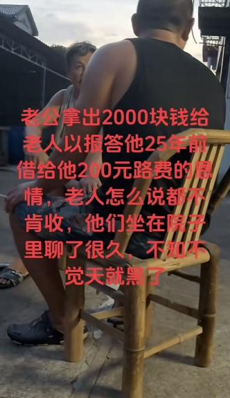 暖心!男子带着家人从上海到浙江慈溪找寻25年前给他200元路费的恩人。没想到,他们一见面,老人一口叫出了他的名字。他掏出2000块钱塞给老人报答恩情,老人不肯收,他们和老人聊到天黑才返程回家。 “你是不是当年那个没钱回家的小年轻?” 慈溪一栋老楼的门口,80岁的大爷刚开门,盯着眼前的陌生男人看了几秒,就说出了这句话。 门口的李先生瞬间红了眼眶,身后的老婆赶紧拉了拉孩子的手,手里拎着的牛奶和坚果袋还微微晃着。 谁也没想到,时隔25年,大爷居然还能一眼认出他。 可找到大爷之前,李先生差点就放弃了。 今年10月中旬,他从上海开车带家人到慈溪,先去了当年打工的工厂。 厂子还在原来的地方,外墙刷了新漆,可大门锁得紧紧的,里面空荡荡的,连个问路的人都没有。 他在附近转了快两个小时,问过修自行车的师傅,也问过小区里晒太阳的老奶奶,都说没听过这么一位大爷。 直到路过一个包子摊,一位老爷爷说“好像有这么个人,住前面老小区”,他才又重新有了方向。 这一切的源头,得回到2000年。 那时候李先生才十七八岁,第一次离开家到慈溪打工,进了一家小工厂。 年纪小不懂事,发了工资就买花哨的衣服,跟工友去路边摊吃宵夜,没几个月就把钱花得一干二净。 到了年底要回家,他翻遍口袋连车票钱都没有,只能蹲在宿舍走廊里偷偷掉眼泪。 厂里负责打扫卫生的大爷知道后,当天下午就揣着200块钱来找他,塞到他手里说“拿着买票,别让家里人担心”。 那时候工人一个月工资才五六百块,200块得干上好几天,李先生拿着钱,第二天一早就买了票回了家。 从那以后,李先生就没把这事儿忘了。 他跟家里人说,以后一定要把钱还上,还要当面跟大爷说谢谢。 可后来他换了工作去上海,结婚有了孩子,每天忙着上班赚钱养家,找大爷的事儿就一拖再拖。 不过他总跟老婆提起这位大爷,说等不忙了一定要去慈溪找找。 今年他终于忙完手里的项目,老婆说“正好带孩子去,让孩子知道别人帮过咱,咱得记着”,他才赶紧买了礼品,带着家人出发。 进了大爷家,李先生从包里拿出2000块钱递过去,说“当年多亏您给的200块,我才能回家”。 可大爷连忙摆手拒绝,说“就是帮个小忙,哪能要你的钱”,最后只收下了带来的礼品。 两个人坐在客厅里聊天,从当年工厂里的趣事,聊到现在各自的生活,大爷问他孩子多大了,李先生问大爷身体怎么样,一聊就到了天黑。 这事儿被邻居拍了视频发到网上,评论区里一下子就热闹了。 有人说“25年还能记着恩情,这人品没话说”,有人吐槽“我借同事5000块,结果被拉黑了,对比太明显”,还有慈溪本地网友留言“为咱们慈溪的大爷骄傲,欢迎常来”。 甚至有人分享类似的事儿,说四川有个小王,2019年在深圳丢了手机钱包,便利店张阿姨给了他100块,2024年他专门开车去还礼,张阿姨都快忘了这事儿。 晚上7点多,李先生带着家人开车回上海,孩子坐在后排还问“爸爸,以后还能来看爷爷吗?” 他笑着说“当然能”,从后视镜里还能看到大爷站在小区门口挥手。 这一路他心里特别踏实,虽然钱没送出去,但能把憋了25年的感谢说出口,能看到大爷身体硬朗,就觉得这趟没白来。 现在大家生活节奏快,好多事儿过几天就忘了,可李先生记了25年,还专门跑一趟。 大爷帮了人不图回报,25年后还能认出当年的小伙子。 有人说“不就是几百块钱,没必要这么麻烦”,可更多人觉得,钱多少不重要,重要的是那份记在心里的恩情,还有愿意回报的心意。 就像网上有人说的,这样的善意和感恩,才是最让人心里暖和的东西。 那么到最后,如果是你们会这么做吗? 如果各位看官老爷们已经选择阅读了此文,麻烦您点一下关注,既方便您进行讨论和分享,又能给带来不一样的参与感,感谢各位看官老爷们的支持!