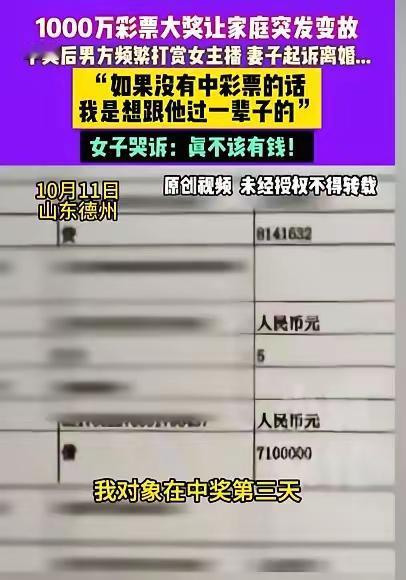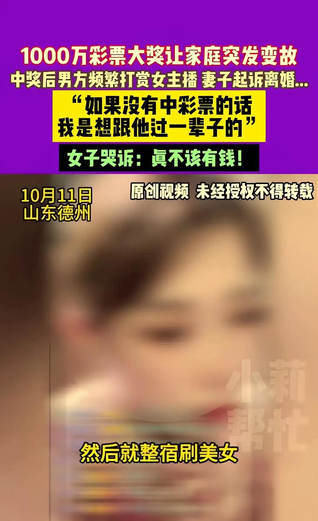 42块钱中了1000多万,最后却闹到要离婚!这笔钱到底是天降横财,还是飞来横祸? 山东的苑女士现在肯定觉得是后者。 中奖前,她和丈夫省吃俭用,日子过得虽然不富裕,但也算安稳。 可当814万奖金到手后,丈夫彻底变了。他辞掉工作,天天泡在麻将馆,晚上就给女主播刷礼物,光给一个主播就刷了120多万。 更过分的是,他还带那个主播出去旅游。 而对苑女士,他承诺的300万养老卡,里面一分钱都没有。 连件新衣服都没给她买过。 直到苑女士发现丈夫和主播的亲密行为,心彻底死了,提出离婚。 这时才发现,丈夫早就把大部分奖金偷偷转移走了。 这笔42块钱换来的千万大奖,最终照出了人性的贪婪和凉薄。 没钱时还能相濡以沫,有了钱反而成了陌路。