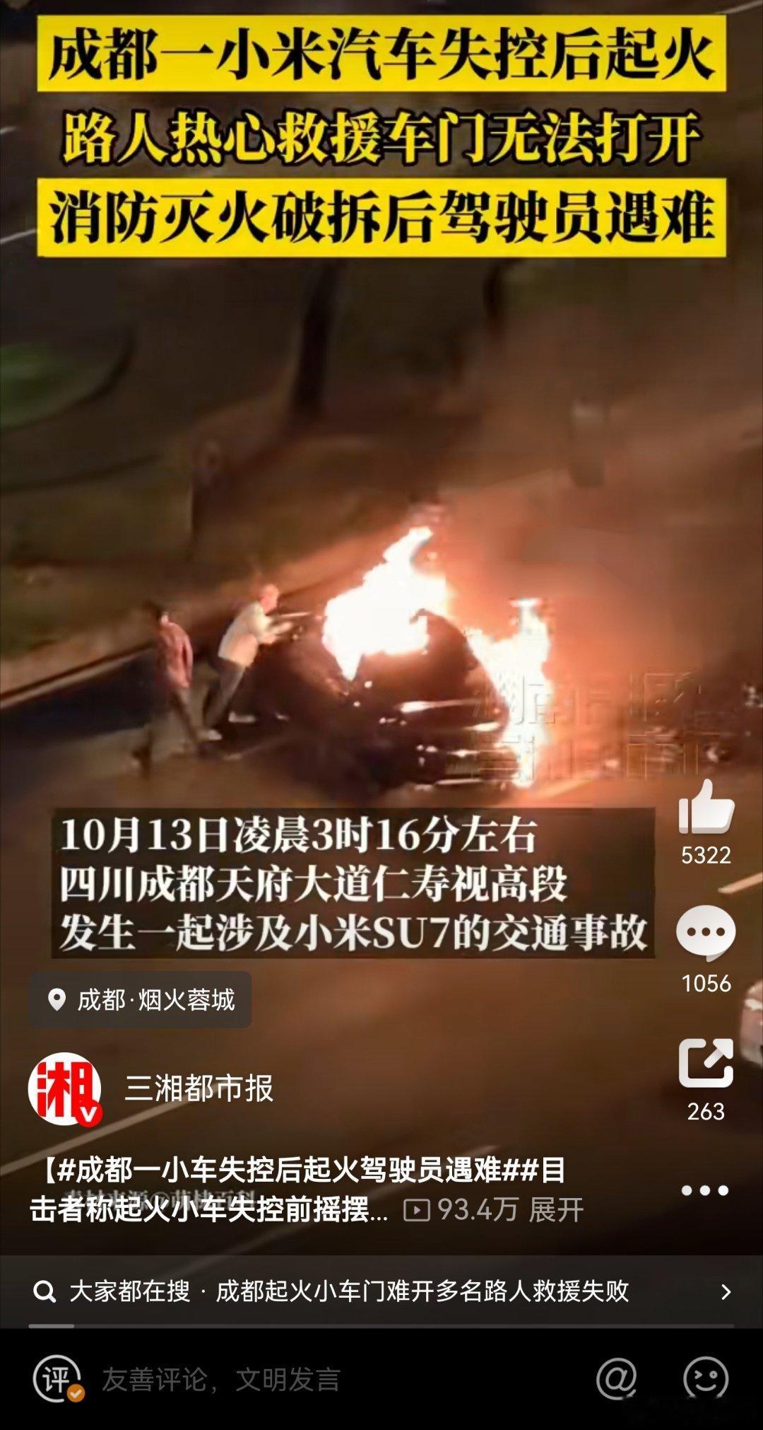 我的天呐,太可怕了,小车失控了,还起火了,关键是骂驶员还遇难了。