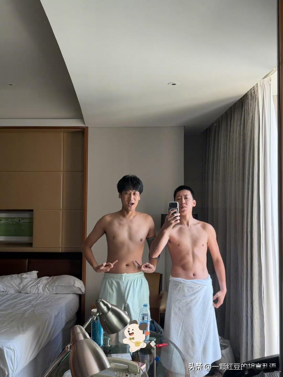 留几手脱了上衣,和另外一个同样裸着上半身的男子,对着镜子自拍。随后,他把合照发到