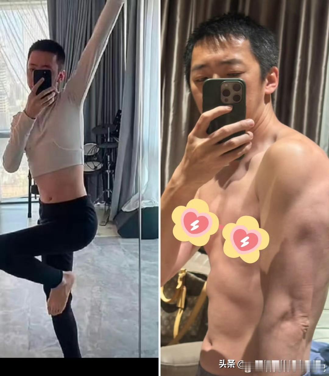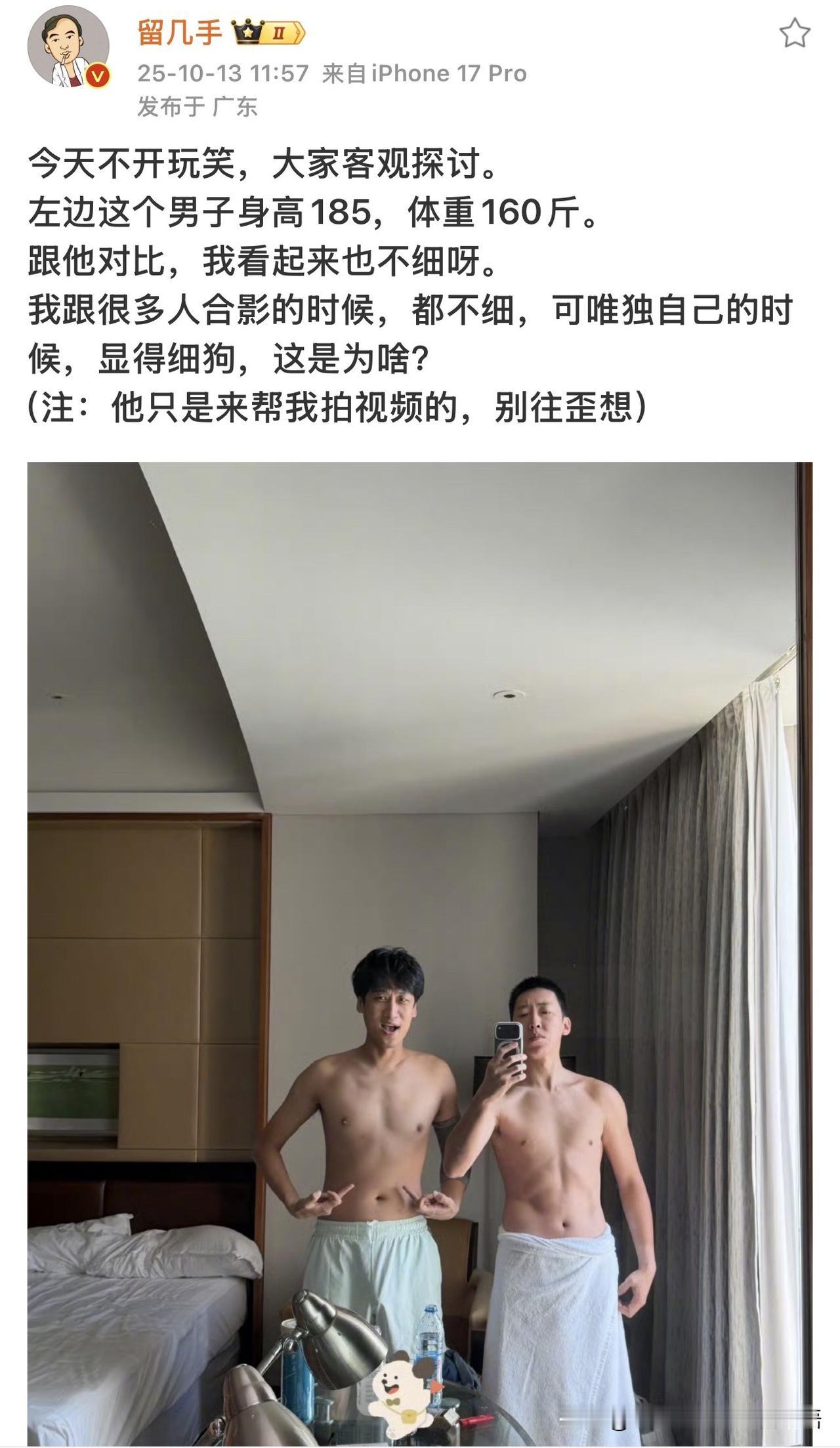 留几手脱了上衣,和另外一个同样裸着上半身的男子,对着镜子自拍。随后,他把合照发到了网上,说:跟他对比,我看起来也不细呀。 有网友帮忙寻找原因: 网友:你肩窄! 留几手:我俩一样,都是47.5! 网友:你溜肩+无胸肌 网友:照片观感:左边比你更紧实 留几手:并没有。我体脂率比他低很多。 网友:但是那个人他满脸荷尔蒙爆棚!! …… 其实上了《再见爱人》后,留几手已经有去打网球健身的,可是就是不知道为什么,给人的感觉就是瘦瘦小小的(他口中的细)。我是觉得,有没有一种可能,就是他以前的照片还是太深入人心了,所以无论怎么练,都没用。