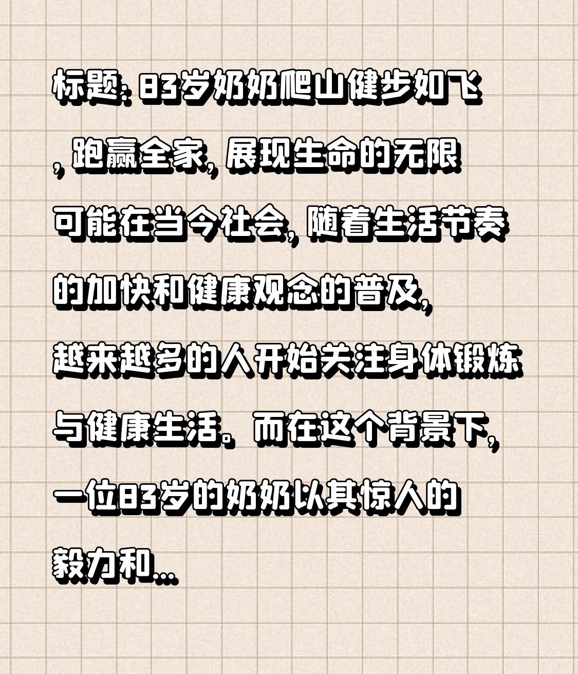 标题:83岁奶奶爬山健步如飞,跑赢全家,展现生命的无限可能 在当今社会,随着生