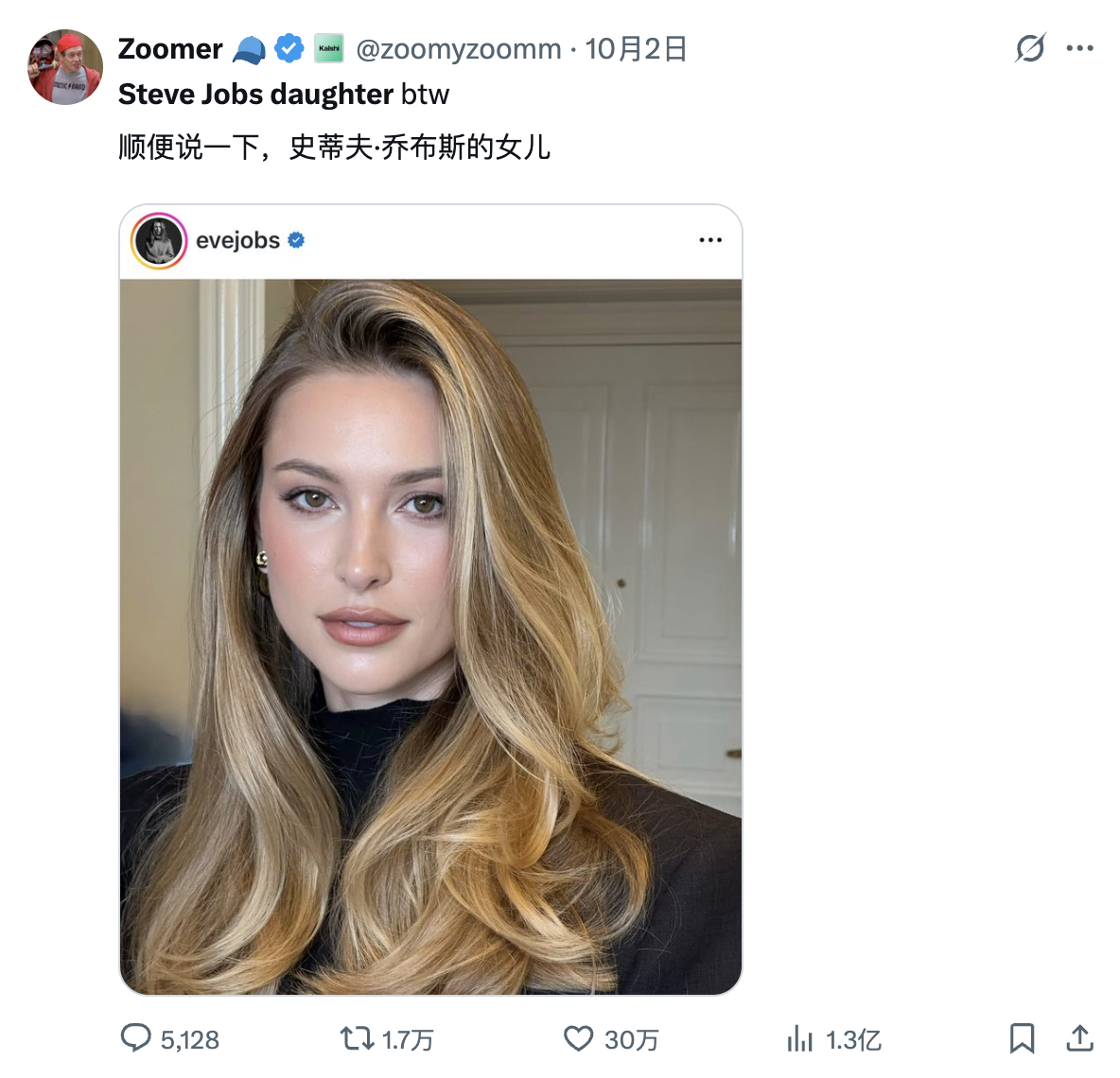 前几天有个博主发了乔布斯的女儿 Eve Jobs,莫名就上了热搜,拿下了 1.3 亿浏览量,然后 X 给了他 1.15 万美金的创作者收入。