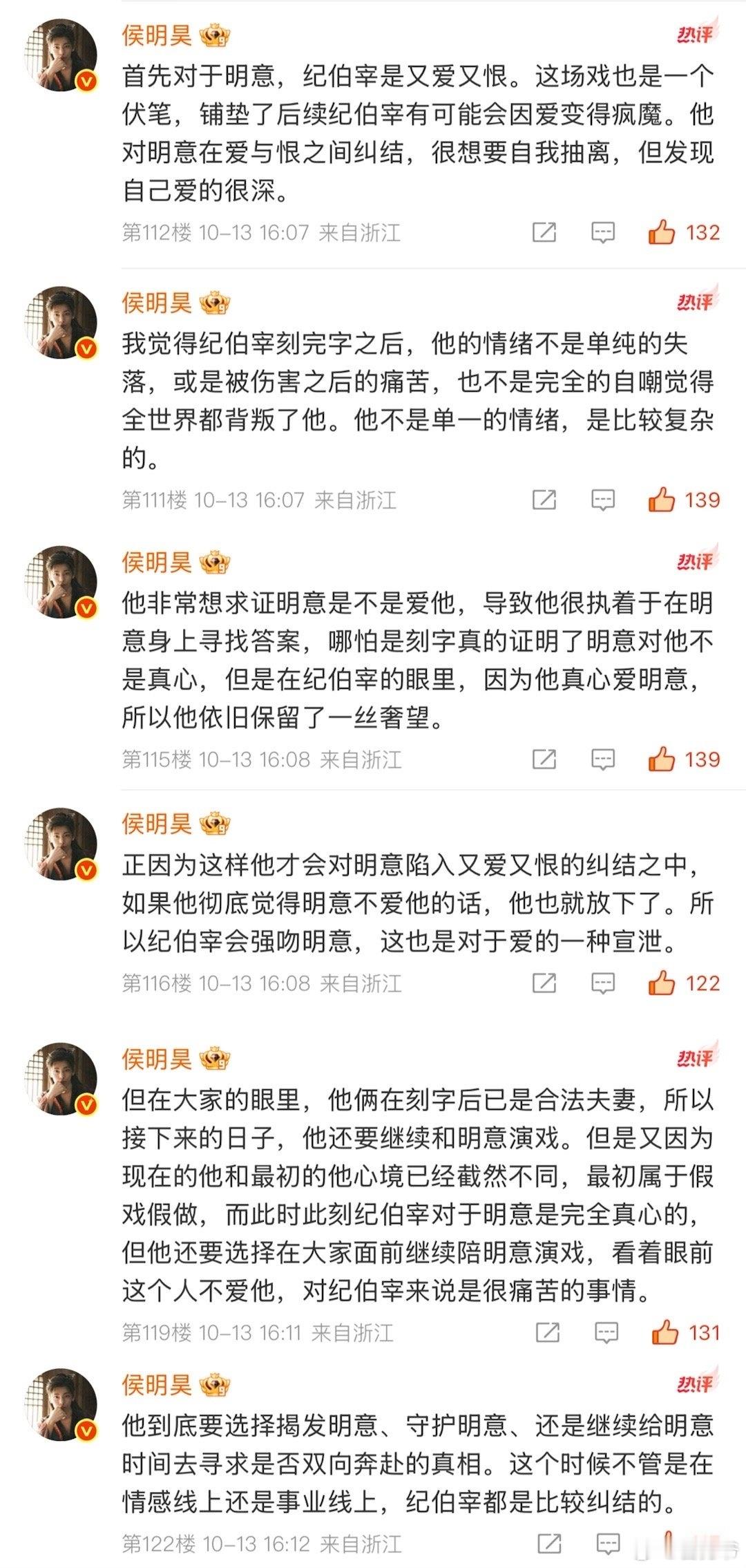 侯明昊为了纪伯宰连回六条评论 侯明昊的心真的是为纪伯宰跳动的,他对纪伯宰的执着,真是让人心疼。每一条评论背后都有他对角色的深情。