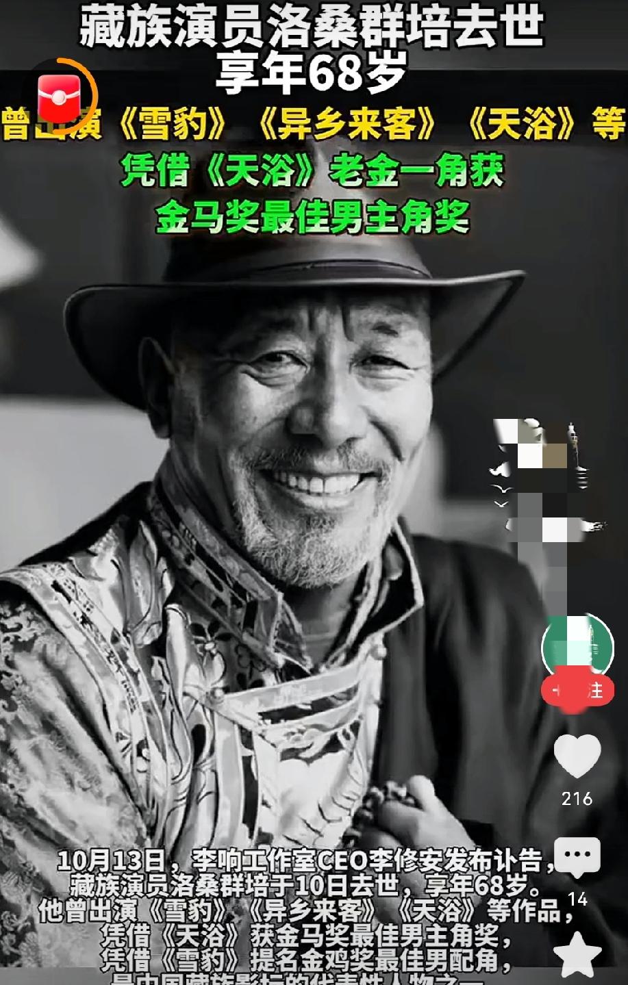 68岁的著名男演员洛桑群培因病去世;洛桑群培曾说过关于生死的金句, 不得不说,真是人间清醒! 他曾说过:“雪山会融化,湖泊会干涸,人这一辈子,就像转经路上的石子,被时光磨圆了棱角,最后都要回到大地里去。” 感觉他对生死看得比较通透; 其实人生在世,生来病死是自然规律,所以从出生那一刻起,我们就应该明白,我们是来体验生命的,什么都不能拥有,也什么都留不住; 人生的烦恼就是我们太贪心了,不要太执着,要像老师一样做个自由的人! 他这一走,好多人都舍不得。 但想想他说的“石子论”,又觉得挺释然。他这辈子把演戏和人生都活明白了,虽然人走了,但那些经典角色、那些通透的话,就跟他说的石子一样,在咱们心里落了根。 洛桑群培老师,一路走好!洛桑活佛 演员病逝