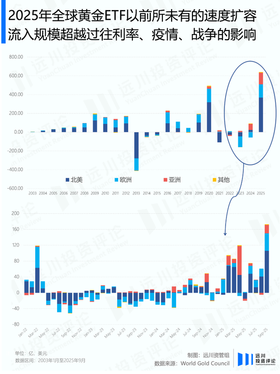 以黄金ETF为视角,2022年至2024年,尽管全球多次爆发地缘冲突或局部战争,但在美联储的加息周期里,金融市场的投资者,尤其是欧美地区的资金整体持续流出黄金ETF。