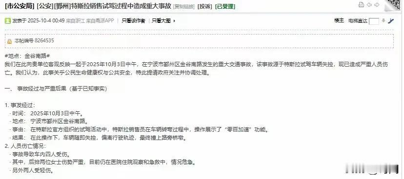 特斯拉销售展示百公里加速失控致4人受伤,其中两人重伤。事发10月3日中午时间,在宁波市鄞州区金谷南路一家特斯拉4S店附近,发生一起单车事故,致车内4人不同程度受伤。 据了解,当时是这家特斯拉组织试驾活动,几名顾客参加活动,乘坐销售员试驾的特斯拉。销售员在一处弯道时,操作展示“零百公里加速”功能过程中,车辆发生失控撞上路边桥墩,导致车内4人受伤,其中2名女士伤势严重住院。 目前警方已经介入处理,初步确认为试驾销售违规操作所致。目前4S店已经为受伤的几人垫付了部分费用,后续赔偿和责任划分处理还在进一步调查中。