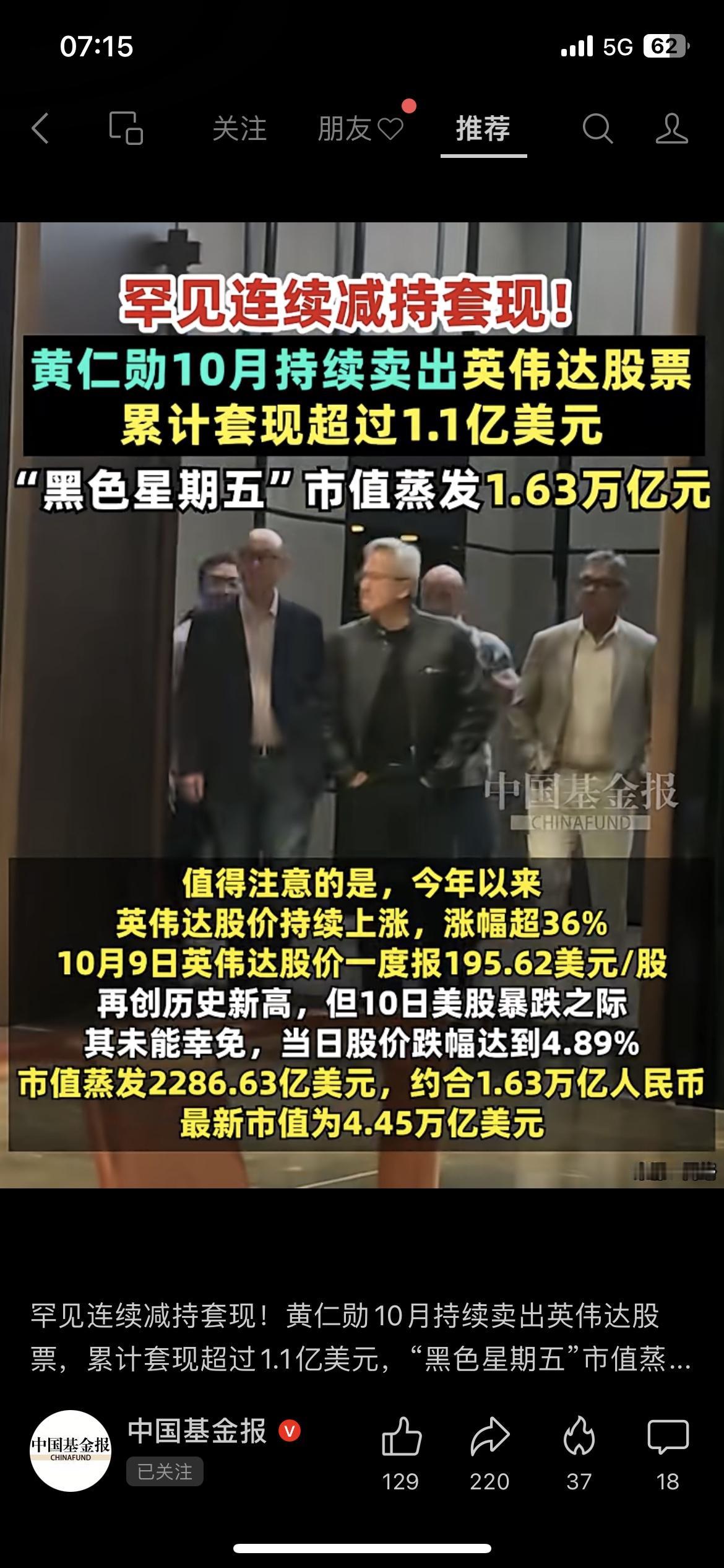 黄仁勋狂卖英伟达股票套现1.1亿美元!黑色星期五市值蒸发1.63万亿,这波操作你