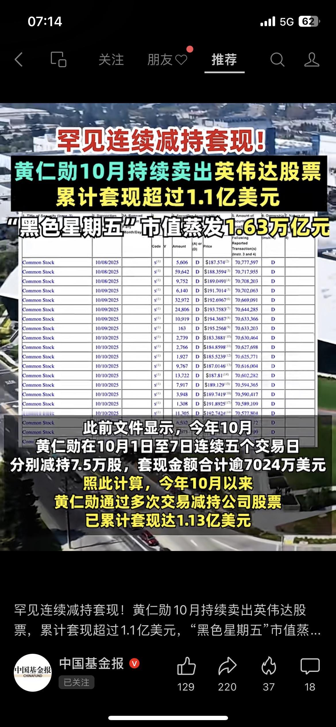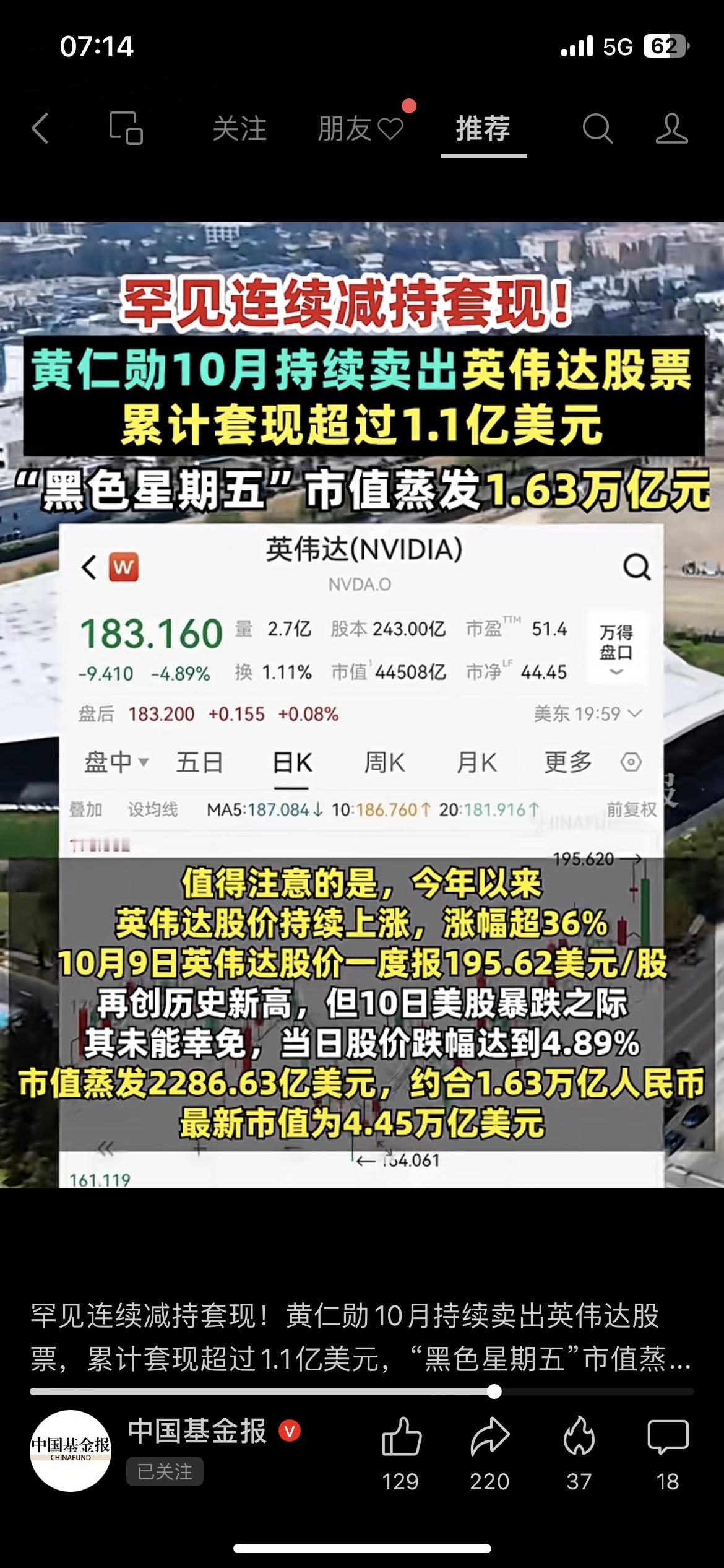 黄仁勋狂卖英伟达股票套现1.1亿美元!黑色星期五市值蒸发1.63万亿,这波操作你看懂了吗? 家人们,科技圈大新闻!黄仁勋10月疯狂减持英伟达股票,累计套现超1.1亿美元,紧接着英伟达就遭遇"黑色星期五",市值直接蒸发1.63万亿元!这波操作是不是有点太巧合了? 咱就说,黄仁勋作为英伟达的掌舵人,在股价创新高的时候连续减持,这信号也太明显了吧?要知道英伟达今年股价涨了36%,结果他一卖就暴跌,这是精准逃顶还是另有隐情? 我觉得啊,这事儿绝不是简单的套现那么简单。要么是黄仁勋知道些内幕消息,要么就是美股科技股的泡沫真的要破了。你们说,这波减持对英伟达后续走势影响有多大?咱们普通投资者还敢不敢碰科技股了?评论区聊聊,也让我看看大家都是怎么分析这波操作的! 英伟达 英伟达行情 英伟达股价行情
