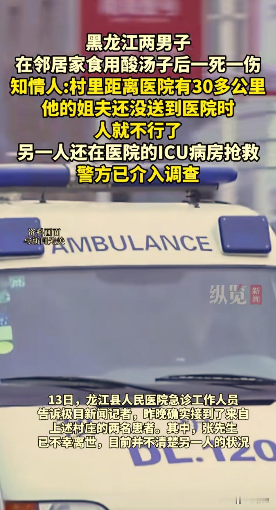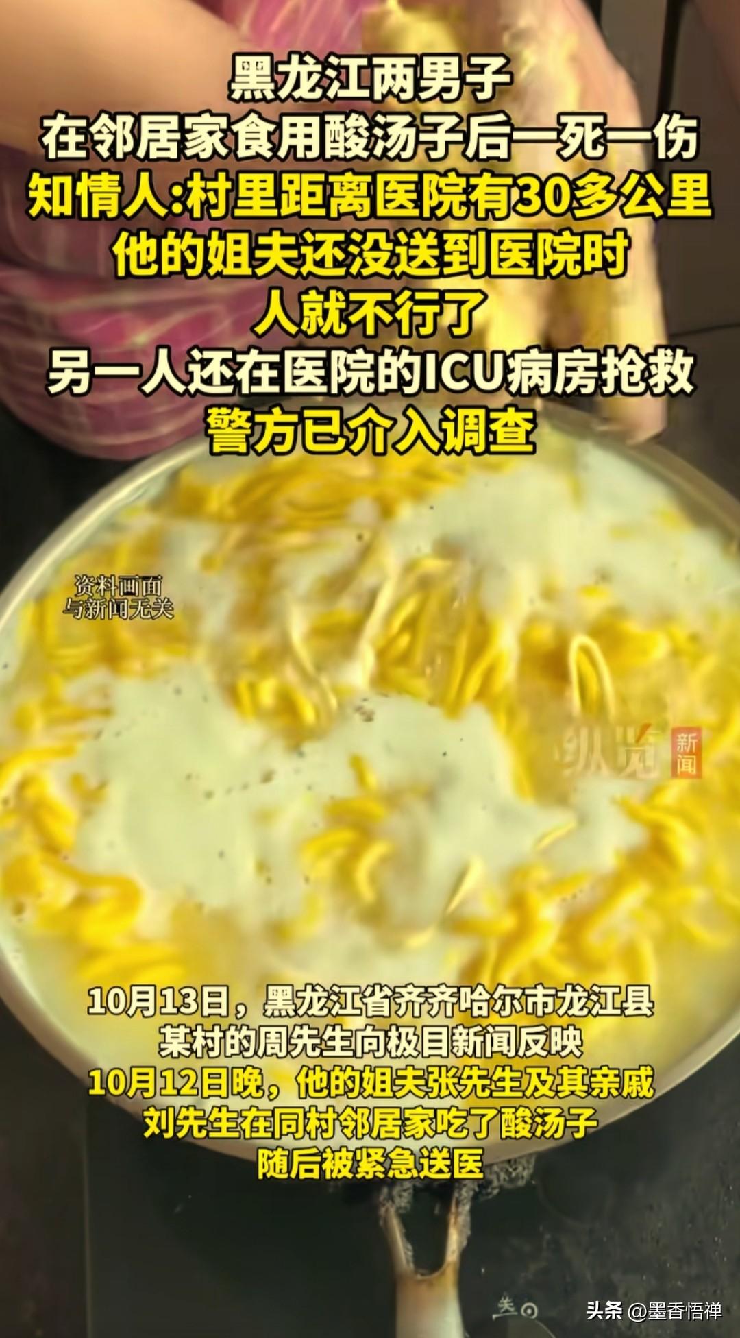 又是一起悲剧,黑龙江两男子食用酸汤子后一死一伤。 2025年10月12日晚,黑龙