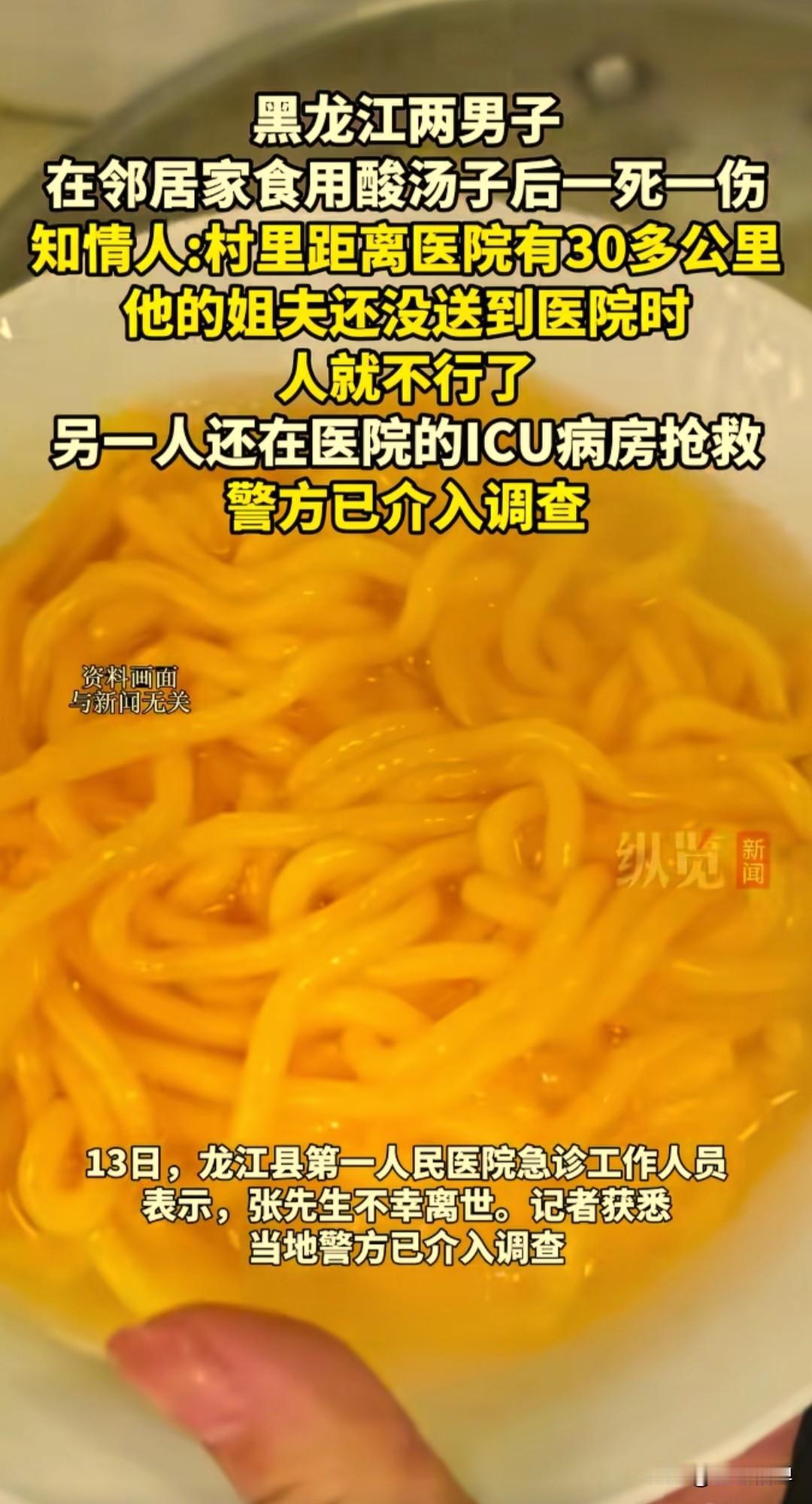 又是一起悲剧,黑龙江两男子食用酸汤子后一死一伤。 2025年10月12日晚,黑龙江省齐齐哈尔市龙江县的张先生和刘先生帮同村邻居收割玉米后,留在邻居家里吃饭,一起吃了酸汤子。 当晚一起吃饭的还有几个人,但是酸汤子就他们两人吃了,吃完饭后不久,两人身体出现不适就紧急送往医院。 由于村子距离医院有30多公里,张先生在送医途中不幸离世,刘先生还在医院ICU病房抢救。 龙江县人民医院急诊科确认了此事,接受了患者,当地警方已介入调查,具体原因有待官方进一步通报。 来源:纵览新闻 关于酸汤子中毒事件这个不是个案了,2020年10月5日,黑龙江省鸡西市鸡东县,一个家庭12名成员聚餐,其中9位长辈吃了家中自制的酸汤子。 当天中午食用过酸汤子的9人陆续出现身体不适,全都紧急送医,尽管全力抢救,到10月19日,最后一名幸存者也不幸离世,本次事件最终造成9人死亡。 酸汤子是流行于东北地区的一种传统主食,由玉米水磨后发酵制作,口感酸甜,外形类似粗面条。 最大的嫌疑元凶是米酵菌酸,米酵菌酸的毒性非常强,仅1-1.5毫克就可能导致成年人死亡。 毒素如何产生的?制作酸汤子的发酵过程,如果卫生条件不佳,或原料被椰毒假单胞菌污染,在适宜的温度和湿度下,细菌会大量繁殖并产生米酵菌酸。 这些令人痛心的事件,再次给人们敲醒了食品安全的警钟,对于家庭自制长时间发酵类食品,必须保持高度警惕。