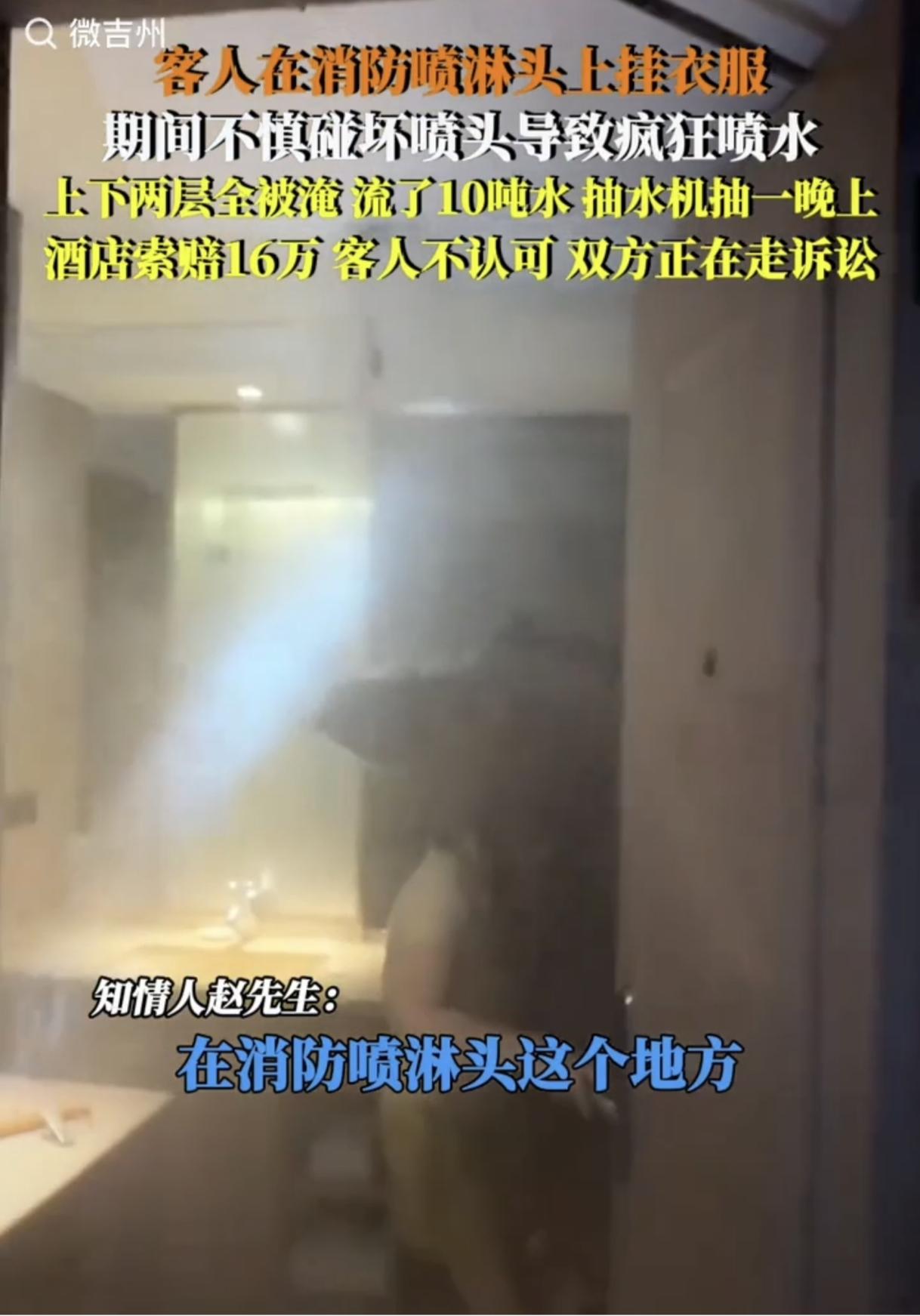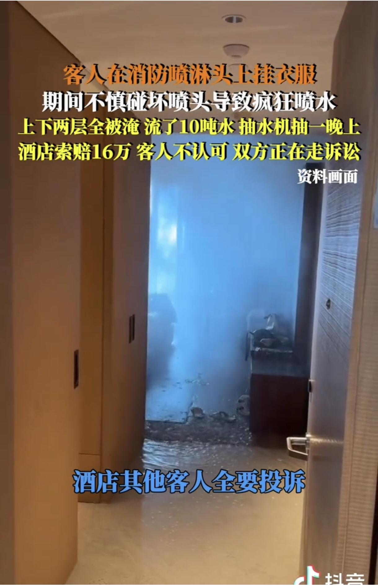 “代价太大了!”国庆期间,一位客人在消防喷头上晾衣服,不料闯下大祸,消防喷头被损坏流了10吨水,淹了宾馆上下两层楼10余间房,被宾馆索赔16万元。客人认为金额太大不认可,双方协商不成,只得通过法律途径提起诉讼解决此事。网友:说实话16万赔偿真心不多,赶紧赔吧,不然赔得还更多。 (来源:中安在线,微吉州等) 十一国庆期间,浙江,一位客人在宾馆房间的消防喷头上挂衣服晾晒,万万没想到,就是这一不经意的疏忽行为竟然闯下了弥天大祸。 据知情人赵先生透露,客人挂衣服碰坏消防喷头里的红色玻璃装置,导致喷淋头不断往外喷水,将宾馆上下两层楼10余间房全部淹了,即便宾馆及时关了阀门,水管里的水仍旧全部流完才止住,大概流了10吨水,这下真成了“水漫金山”,抽水机也抽了整整一个晚上,宾馆损失惨重! 当时正值十一黄金周期间,宾馆里住满了客人,大量客人投诉并要求宾馆退房退款,加之楼层被淹,近期旅游旺季里宾馆显然不能住人了,因此宾馆还面临营收大幅度下降的客损问题。而鉴于维修费用、停业造成的经营损失等,宾馆定损为16万,向客人发起索赔。 但16万并不是小数目,客人认为宾馆索赔金额过高并没有认可,双方没能达成一致意见,只得通过法律程序提起诉讼来解决此问题,目前正在进行中,最后怎么赔还要拭目以待。 对此,网友们热议不止。有网友说,真是人才啊,那客人是怎么想到在消防喷淋 头挂衣服的?这下长记性了吧。 也有网友说,消防是自动起泵的,就是没有手动关闭,要整栋楼水管储存的水流完才行,但是酒店应有应急流程,这种喷头破碎预案都会有的,破碎了10分钟就可以关闭阀门,怎么可能流一晚上? 还有网友说,淹了人家两层楼,才让赔偿16万,算是良心价了,房间修复成本和旅游旺季运营损失可不低哦,如果房间设备、地面瓷砖、线路、施工的物料费、人工费、员工休息期间的工资、自己停业期间的损失、客人的损失等这些都统统算在内的话,怕是只多不少,16万赔偿真心不多,真赔偿下来怕不只这个数,说不定还要赔五六十万呢。 这个案例,让人感慨万千啊。 不得不说,那位客人是没有一点生活常识啊,酒店里的喷淋头可是在火灾发生时及时喷水灭火确保人员和财产安全的设施,怎么可以拿来挂衣服啊,这下惹天滔天大祸了。 那既然因疏忽导致酒店损失惨重,客人就存在明显过错,赔偿宾馆损失自然无可厚非的,但最终还要根据宾馆的实际损失情况来确定,至于赔偿16万是否合理也要根据维修费用清单、停业造成的经营损失等来确定。 当然,宾馆也存在一定的安全管理漏洞,如有没有设置提醒客人不要在喷头上面悬挂物品的警示标识,以及宾馆的设施维护有没到位,还有为何阀门关了管道里的水还要流完才止,说明宾馆应急处理还不够有效及时,未能将损失降到最低。 这也给我们提了一个醒:出门在外一定要有安全意识,对于喷淋头这种装置一定要明白其重要性与敏感性,避免因自身不当行为引发安全事故与财产损失。 酒店行业也要反省自己在管理上存在的问题,如有没有合理设置专门晾衣区以满足客人的实际需求,还要加强对家人安全教育与提醒,以减少类似事件发生。