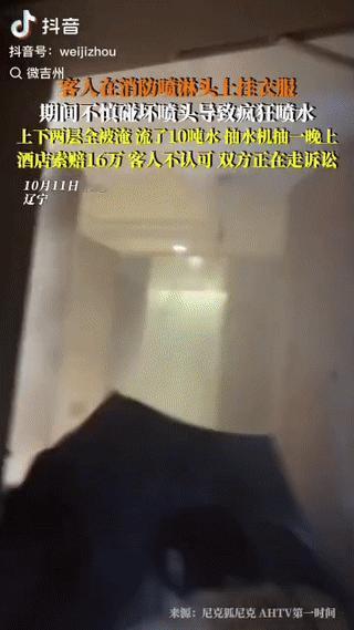 “代价太大了!”国庆期间,一位客人在消防喷头上晾衣服,不料闯下大祸,消防喷头被损