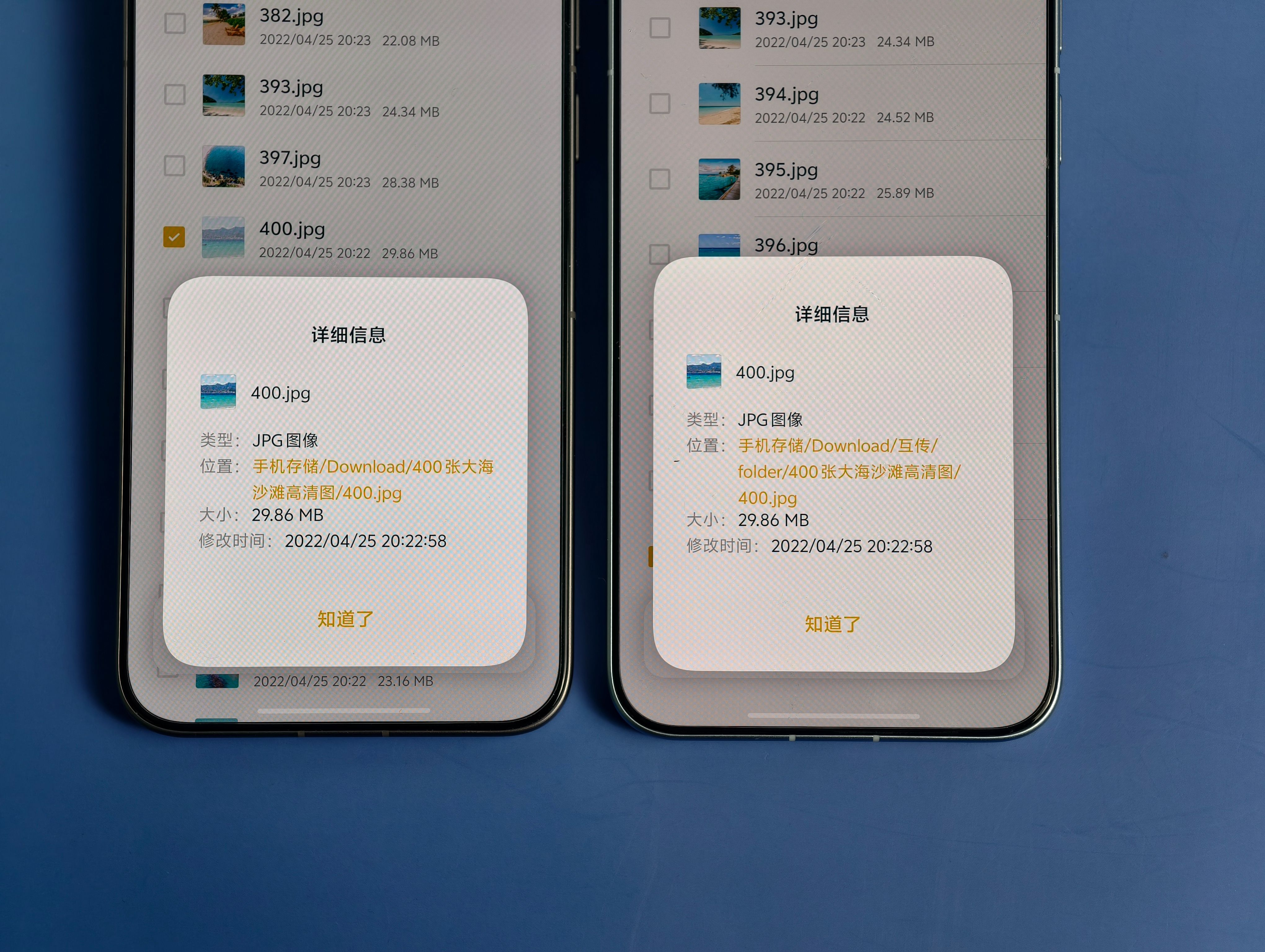 然后是400张高清图,传完只用了1分钟多一点,而且任意选择一张照片,大小完全一致,也就是说没有一点压缩,照片是接收方的手机相册中显示,再也不用像之前先微信、再下载了,空出的内存它不香吗?