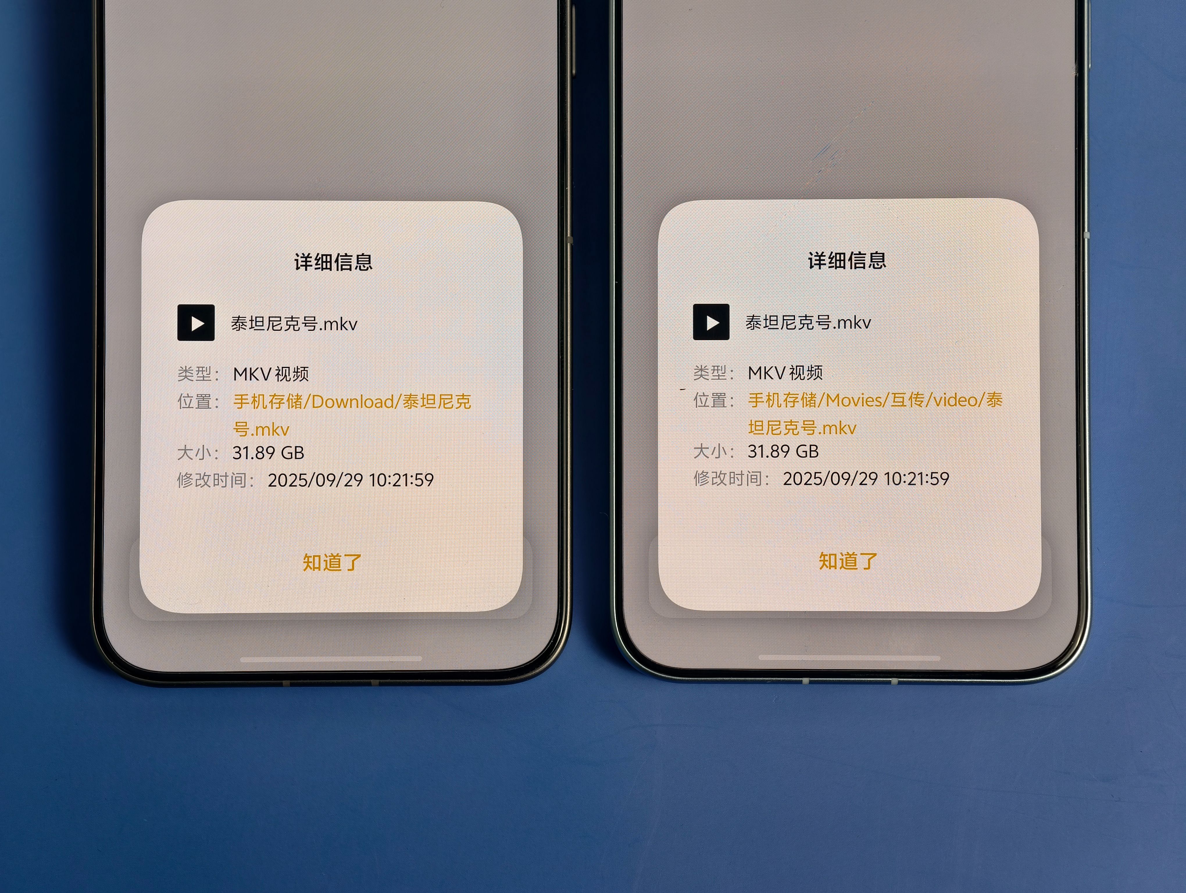 在Wi-Fi环境下,可以看到视频传输速度为78.4M/S,和官方介绍的80MB/S大差不差,31.89GB的电影传输结束大概是8分19秒,这个时间长度还是可以接受的,而且可以看到整个视频的大小是完全一样的,也就是说画质没有一点压缩。