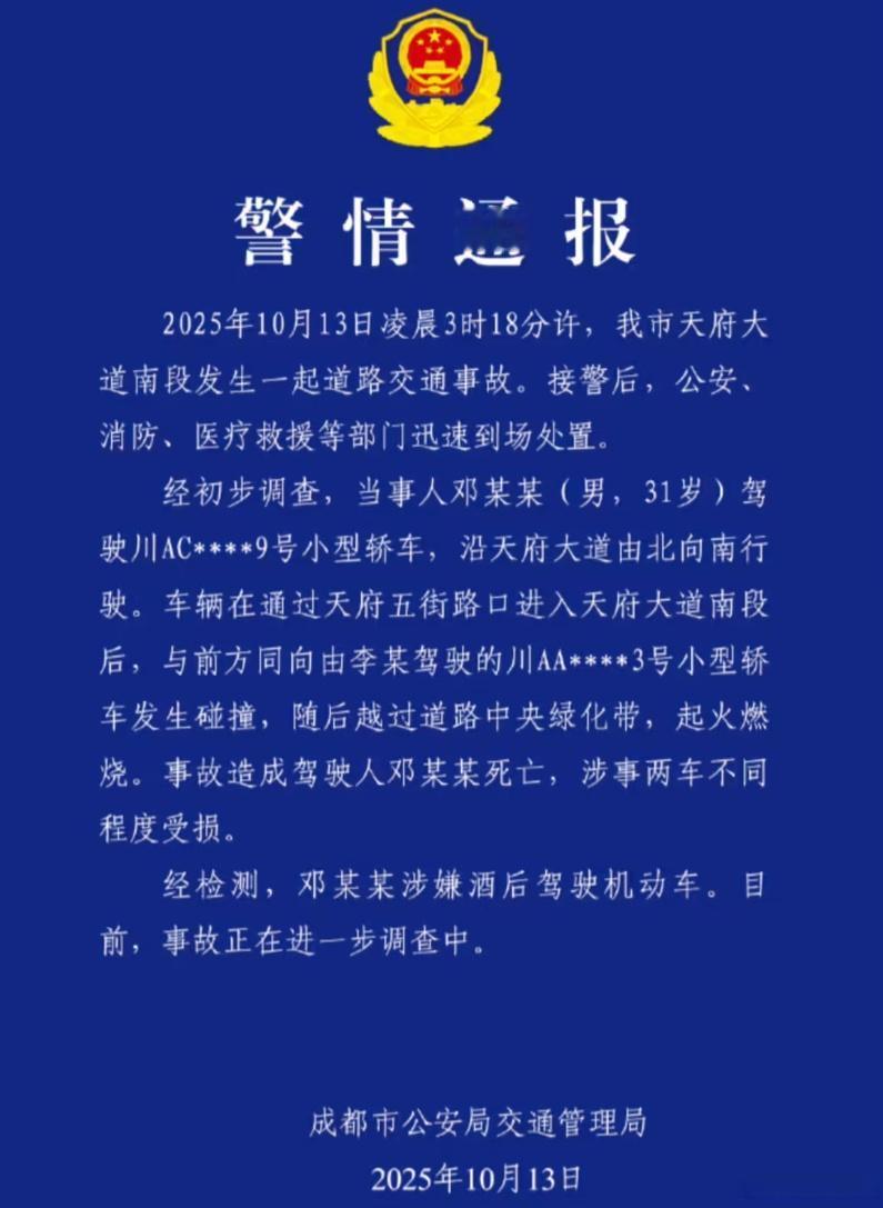 13号凌晨天府大道发生惨烈车祸,一辆小米SU7像失控的子弹般撞上绿化带,翻滚着