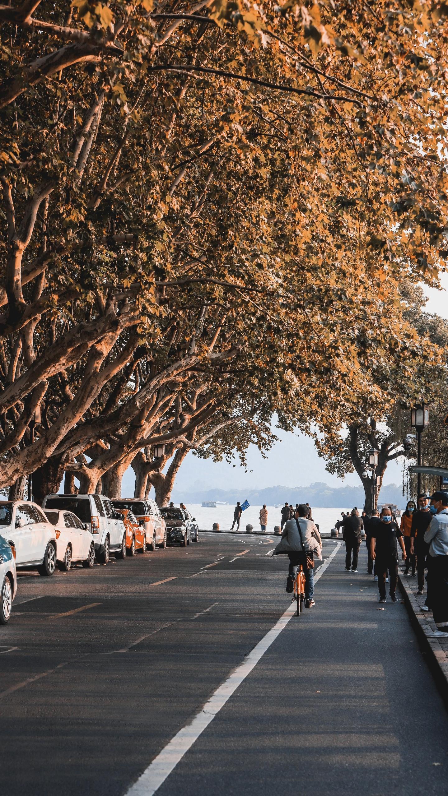 下午3点 - 日落(首选!):此时的阳光从西边斜射,为西泠桥、梧桐树和1314路公交车镀上一层温暖的金色光芒,光线柔和,氛围感绝佳。