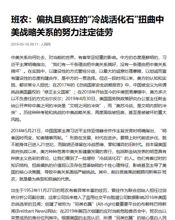 白宫首席策略师史蒂夫·班农当地时间10月12日写道:“特朗普提出和平……中国选择战争。”班农还转发了Politico的评论文章:“特朗普要达成贸易协议,中国却开辟了新战线。” 班农这话玩的还是他那套老把戏——给中国扣帽子、替特朗普造声势。 作为特朗普主义的老推手,班农打从十几年前就靠煽动仇恨吃饭,之前编过病毒阴谋论,说中国欠美国数万亿,现在换了个“和平与战争”的说法,本质上还是把中国当替罪羊,这套路他早就用得炉火纯青了。 先说说所谓“特朗普提出和平”,这说法简直像没看全剧本就发言。就在班农发文的10月12日,特朗普的副总统万斯刚出来说“总统愿意与中国理性谈判”,可转头看看特朗普干的事,前几天才刚放话11月1日要对中国商品加征100%关税,还限制美国软件出口。 这哪是求和平的架势,分明是先抡起大棒再喊停,华尔街早就把这套路摸透了,还给起了个“TACO”的名字,意思是“特朗普总会认怂”,每次都是威胁完了又延期,雷声大雨点小,无非是想靠极限施压多要筹码。班农故意只提“和平提议”,绝口不提关税威胁,这选择性失明的本事也是没谁了。 再看贸易协议的事儿,更是把黑白给颠倒了。2020年中美签的第一阶段经贸协议,中国可是实打实履行了义务,保护知识产权、扩大进口样样没落下,光2023年就买了美国291亿美元的农产品,占美国农产品总出口的近五分之一,其中大豆就买了128亿美元,差不多占美国大豆出口的一半,平均每个美国农民靠对华出口能赚近9000美元。 可美国呢?签完协议转头就翻脸,2022年10月搞起了芯片封锁,全面限制半导体设备出口,结果当年美国对华半导体出口就降了23%,半导体设备出口降了17.9%。 这哪是想达成协议的态度,分明是自己先撕了规矩,现在倒好,班农反而说中国“开辟新战线”,这锅甩得比谁都利索。 更讽刺的是,美国自己才是贸易战的始作俑者,却总想装受害者。2018年到2019年那波关税战,美国农产品出口直接损失了近260亿美元,农民收入比2017年降了8%,这些账班农是压根不提的。 2025年美国农业部自己都预测,对华农产品出口要跌到220亿美元,这明显是美国自己的政策搞砸了生意,可在班农嘴里,倒成了中国不配合。 要知道中美贸易额从1979年的不到25亿涨到2024年的6883亿,靠的是互利共赢,不是谁单方面施舍,美国在服务贸易每年还能赚中国265.7亿美元顺差,这些好处班农是全当看不见。 至于所谓“中国开辟新战线”,说白了就是中国被卡脖子后不得不搞自主发展。 美国把芯片、半导体这些关键领域卡得死死的,逼得中国只能自己搞研发,结果这在班农眼里倒成了“挑事”。 他这套逻辑跟之前说“中国掏空美国工业”如出一辙,明明是美国资本为了赚快钱把工厂迁到海外,却赖中国抢了工作,这种找替罪羊的手法,跟当年麦卡锡搞红色恐慌、希特勒煽动民族仇恨的路数没两样。 班农自己当过高盛副总裁,比谁都清楚资本逐利的道理,可他就是不戳破,因为一旦承认是美国资本的贪婪导致问题,他那套“美国优先”的谎言就崩了。 班农这么折腾,说到底还是为了政治造势。他最擅长的就是用虚假信息挑起民众恐慌,之前靠布莱巴特新闻挑唆对少数族裔的仇恨,现在又把中国塑造成敌人,无非是想转移美国国内的矛盾。 美国中下层的不满明明是垄断资本掠夺造成的,他却把账算到中国头上,帮特朗普拉拢选票。毕竟他跟特朗普是老搭档,当年就是他帮着打造“美国优先”的口号,现在离选举越来越近,自然要拿出这套熟悉的剧本,哪怕满嘴跑火车也不在乎,反正只要能煽动起情绪,真相根本不重要。 看看班农这些年的操作,从病毒阴谋论到“文明冲突”,再到如今的“战争论”,翻来覆去就那几招,可偏偏有人吃这一套。 他就像个偏执的“冷战活化石”,抱着过时的思维不放,以为把中国描黑就能保住美国的霸权,却忘了时代早变了。