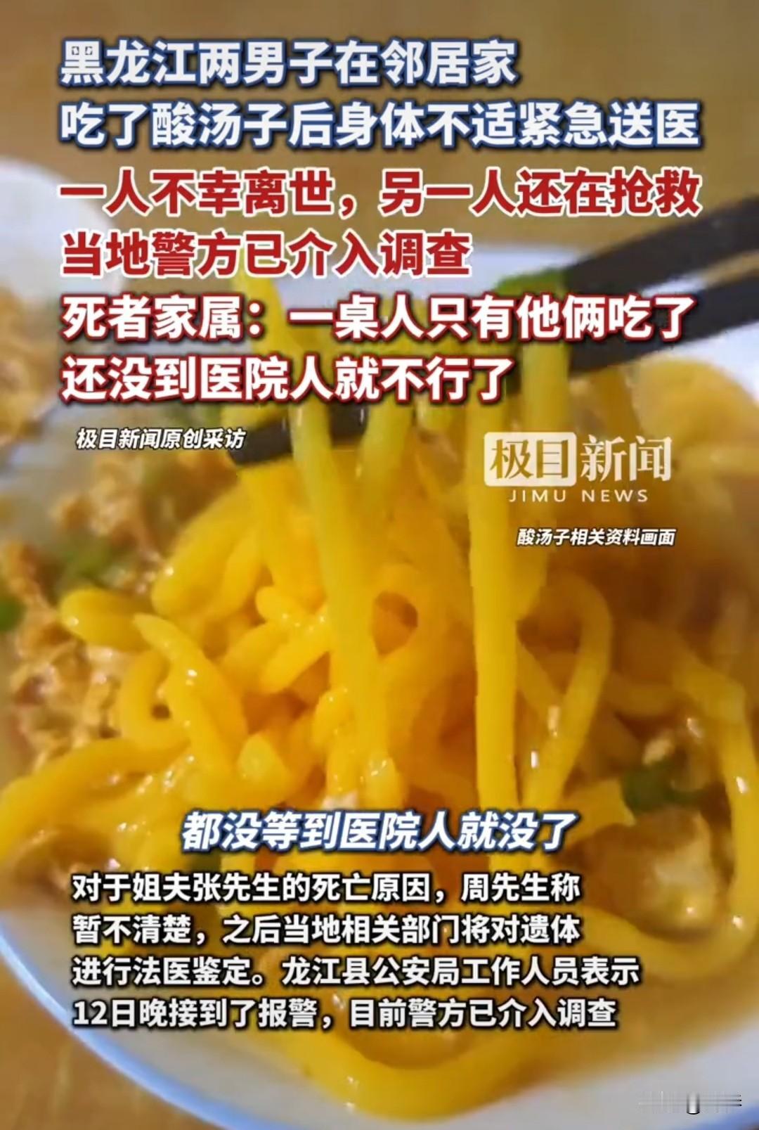 太不幸了!黑龙江齐齐哈尔,龙江县的张某和刘某,就因为帮助邻居家收了点玉米,邻居为答谢来帮忙的众人,特意弄了一桌子好吃的,谁都没想到,等张某和刘某在吃完后,悲剧却不幸发生了。 10月12日,周先生说,他姐夫张某帮同村的邻居收玉米,忙碌了一天。主人家留客吃饭,盛情难却,张某和他亲戚刘某就留下来吃了,而邻居也特意做了一桌子好吃的,里面还有道酸汤子。 一桌子五六人吃饭,只有张某和刘某吃了酸汤子,饭后没多久,两人明显感觉身体不适,没想到在送去医院的路上,周先生的姐夫张某就不行了,而刘某还在icu抢救。 而酸汤子为何物?为什么会中毒呢!正想去查询时,就有网友留言说,酸汤是东北传统美食,是用玉米发酵做出来的,夏秋在制作过程中易被污染产生剧毒米酵菌酸。 像云南、四川等地,市民经常上山采食野生菌子,有时候采到了见手青就会容易中毒,每年吃完中毒致幻的也不在少数。 豆角也是一种常见的蔬菜,但是在没有煮熟的情况下,就容易引起食物中毒。 那么,你们那里有什么好吃但存在安全隐患的美食,说出来,给大家提个醒。