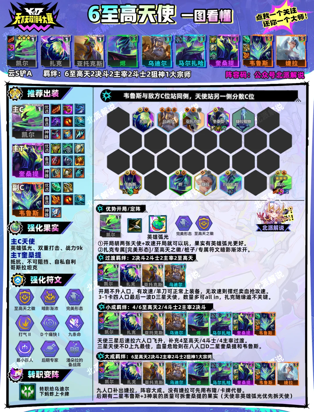 阵容强度:端S铲A 北派连夜蹲的美服大数据网站,发现6至高天使数据的吃鸡率位列第二(排除扎克专属数据,扎克前排装和裸装数据也很高),原因无它,新版本给的太多了:至高天触发时间由5→4,意味着伤害和回复都获得很大提升,同时加强了巨杀(非常适合平推前排的天使)和蚂蚱的蓝条,现在遇到扎克专属[主人公]或开局胡天使+弓就能冲! 阵容构筑:天使、扎克、剑魔、乌迪尔、烬、蚂蚱、奎桑提、韦鲁斯、婕拉 组成羁绊:6至高天2决斗2主宰2斗士2狙神1大宗师,后期提升上限可以将剑魔+乌迪尔替换成决斗李青+可酷伯。 选择前提: ①最高上限是扎克专属[完美形态]或主人公发扎克开,详细玩法/一图流点这里:完美形态 ②常规开局有2张天使+攻速开就可以冲,果实时英雄弧光/战力9k最佳 ③至高天之徽/桩子/专属符文暗影渐浓开,需要卖血抢攻速 果实推荐: 天使:英雄弧光(最大阶段3/人口5)、战力9k(最大阶段2)、双重打击、影分身 战力9k在15.4获得加强,之前削弱的减少蓝量出现与我没蓝条的天使无关。另一个毕业大果是英雄弧光,获得4.5*玩家等级的增伤,10级还有额外35%增伤,直接把终极飞升爆烂了。 奎桑提:抵抗、不可阻挡、自私自利、哥斯拉坦克 奎由于技能的减伤和第二条命,抵抗仍是好果子;另外两条命活得久拿不可阻挡和哥斯拉坦克这两个果也能把控制打满。 韦鲁斯:影分身、突破天际、末日弹幕、精准 一般不给,仅在韦鲁斯二星+3神装后考虑拆奎桑提的果实,天使在没有英雄弧光/战力9k时优先拆天使的果实。 装备推荐: 天使6级后自带20%减魔抗,减抗装提升不大;法穿能出但浪费攻速水滴,离子纯占格子。 主C天使:羊刀+巨杀+法爆/夜刃/鬼书/破防 核心装羊刀必备,输出装最好的是刚加强的巨杀,第三件输出装/保命装都可以。因为刚需韦鲁斯开6至高天和上9飞升,三星天使能直接冲上九是最好的,因此在选择装备时能做就做,不要贪完美装备拖节奏。 神器推荐:迅刃(代替羊刀)中娅(搭配羊刀+1输出)电刀(搭配羊刀+1输出/夜刃)
