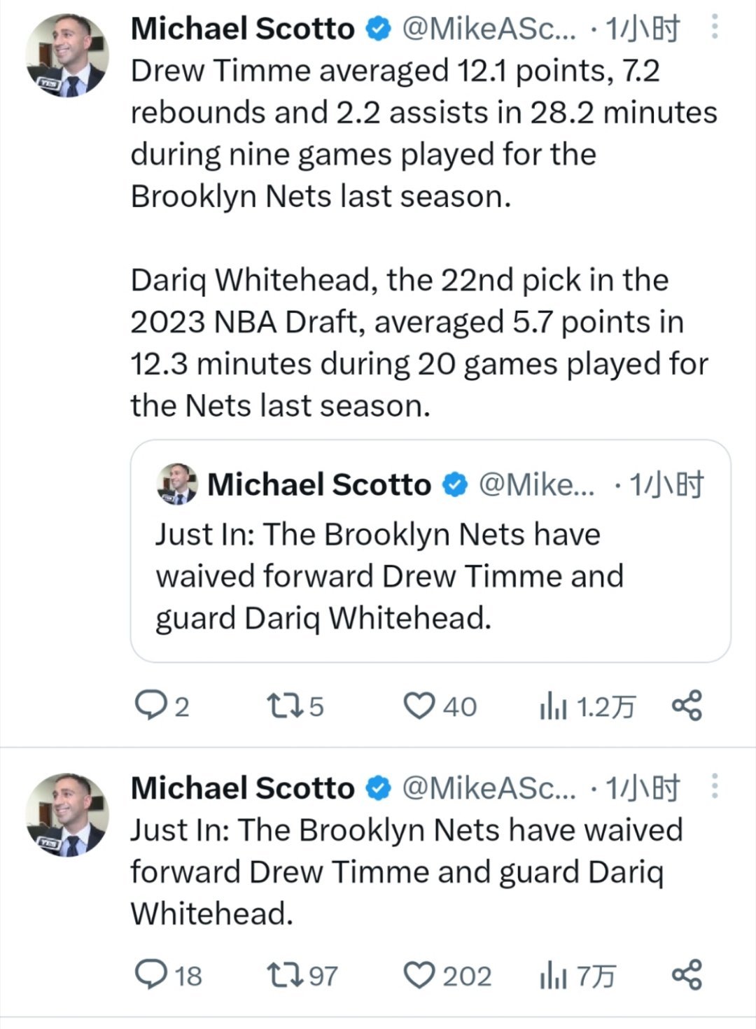 Scotto:篮网裁掉了前锋德鲁-蒂米和后卫达里克-怀特黑德