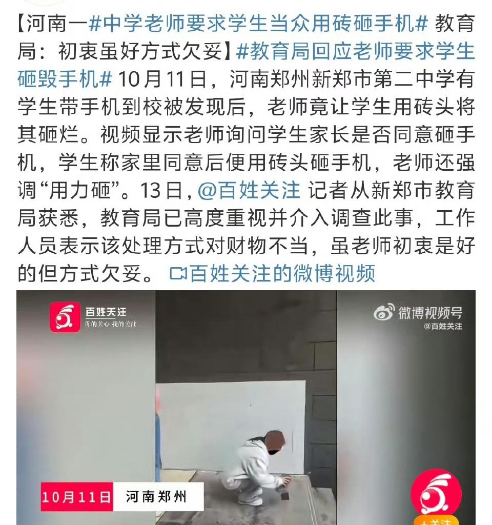 学生带手机被要求用砖头砸毁,老师强调“用力砸”!这教育方式你支持吗? 10月11日,河南郑州新郑二中,有个学生带手机到受校被老师发现了,老师竟让学生用砖头把手机砸烂。视频里,老师问学生家长同不同意砸手机,学生说家长同意后,就拿起砖头砸手机,老师还在旁边喊“用力砸”。 13日,新郑市教育局介入调查。工作人员说,这种处理财物的方式不对,老师初衷可能是好的,但方法确实欠妥。 这事一传出来,网友顿时炸开了锅。有人调侃“明天孩子上天台,后天孩子去游泳,大后天带菜刀来教室做菜”,还有人说老师处理方法太欠妥。 学校管理手机是为了让学生专心学习,可这砸手机的操作也太极端了。你觉得老师这么做合适吗?家长怒砸班主任 家长摔手机 砸孩子手机 学生要手机 学生头被砸 学生遭板凳砸头 校长怒砸学生” 老师怒摔手机 信息来源:百姓关注
