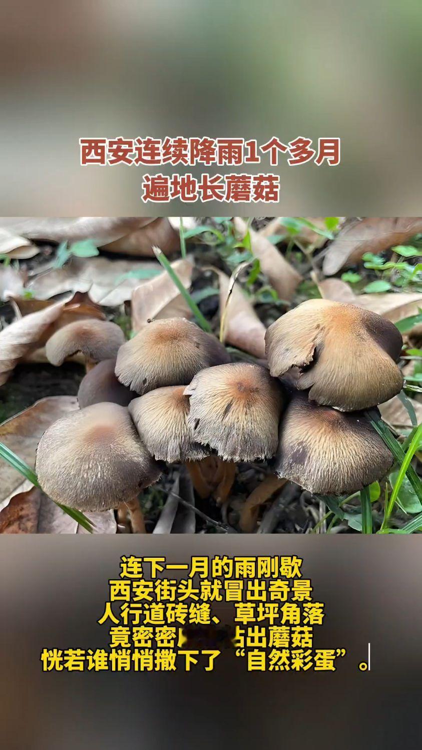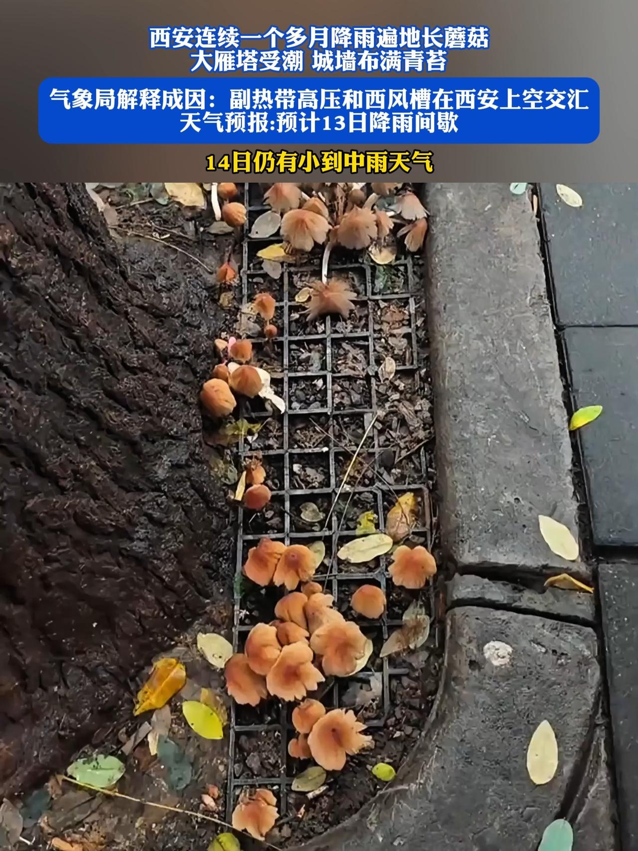 西安的雨停了,城墙长绿、街头冒菇,网友:长安变江南了! 10月13日,陕西西安为期一个多月的降雨短暂停止,漫步西安街头,可以看到遍地长出了蘑菇,大雁塔被雨水打湿受潮,连城墙也布满青苔。这场打破1961年以来纪录的秋雨,把古都浇成了既复古又灵动的模样,朋友圈里全是西安人晒的“自然奇观”。 顺城巷的城墙最是惊艳,600多岁的明城墙青砖上,苔藓如绿色瀑布蔓延,深浅不一的绿意与古朴城垣相映,远看像幅立体水墨丹青。有摄影爱好者蹲在墙根拍了半小时,说这是“岁月长出了生机”,穿汉服的姑娘特意来合影,称城墙像“从画里走出来的。连土生土长的大爷都叹新鲜:活了70年,头回见老城墙穿“绿衣裳”。 街头更成了“蘑菇总动员”现场。曲江新区的行道树下,橙盖鹅膏菌撑着鲜艳小伞;高校草坪上,白蘑菇扎堆像在“阅兵”;世博园的木椅缝里,木耳似黑色蕾丝藏着。市民王女士拍了长椅旁的小伞菌打趣:“再下雨,我头上都要长蘑菇了!” 这调侃戳中了无数人——西安人现在不是“潮人”,是“潮得发霉的人”。 玩笑归玩笑,危险藏在诗意里。有网友盯着校园蘑菇想“清炒尝鲜”,却被疾控部门的“三不预警”泼了冷水:不采、不买、不食野生蘑菇。专家戳破误区:鲜艳的未必有毒,灰白的可能致命,烹煮根本破坏不了毒素。毕竟,古都的浪漫可不能用健康换。 更让人安心的是,城墙景区工作人员早有准备,持续监测文物安全,直言“隐患有人排查,无需担心”。这600年的城墙见惯了风雨,从军事防御到城市地标,在自然洗礼中不断焕发新机。 可惜好景不长,气象台说14日雨又要来了,月底前难彻底放晴。有人盼着晒被子,有人却舍不得这景致:“千年城墙配青苔蘑菇,像穿越回了长安的秋”。 这场雨磨人却也珍贵,让北方古城有了江南的柔情。你身边的雨后有啥惊喜?评论区聊聊~西安雨景 陕西秋雨