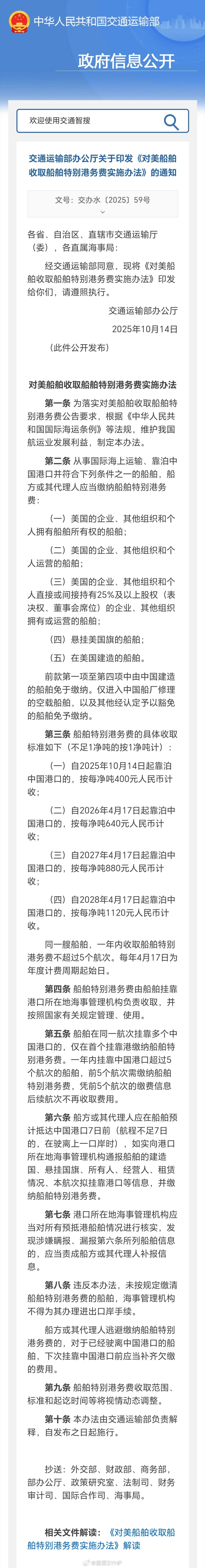 交通部发布对美船舶收费10条实施办法对美船舶收取特别港务费具体标准交通运输部办公厅关于印发《对美船舶收取船舶特别港务费实施办法》的通知